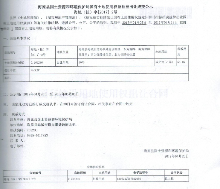 海原县国土资源和环境保护局国有建设用地使用权招拍挂出让成交公示