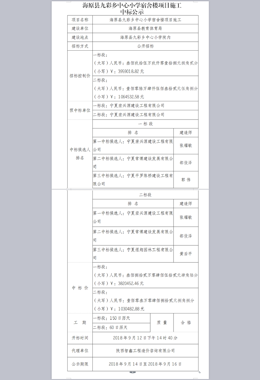 海原县九彩乡中心小学宿舍楼项目施工 中标公示