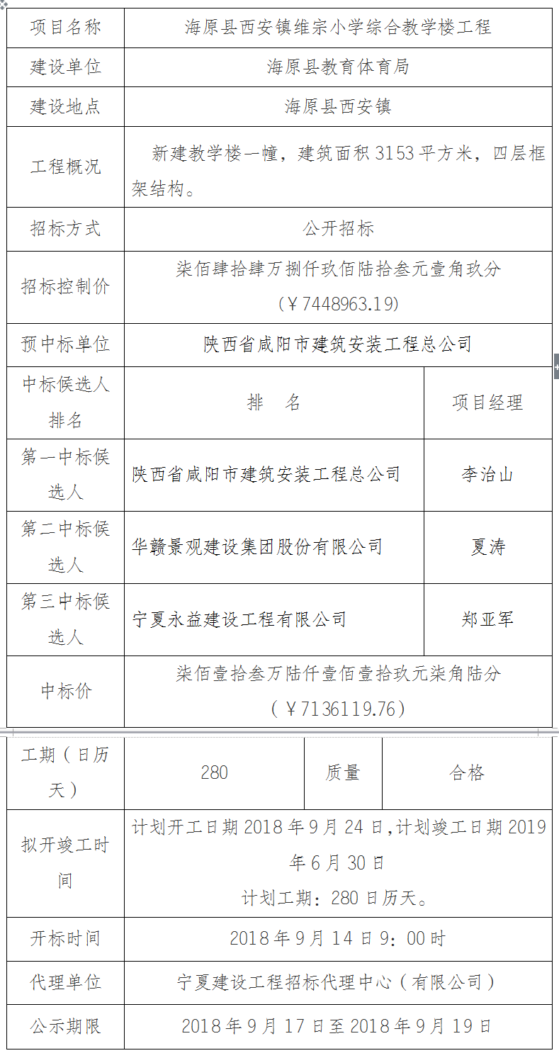 海原县西安镇维宗小学综合教学楼工程中标公示