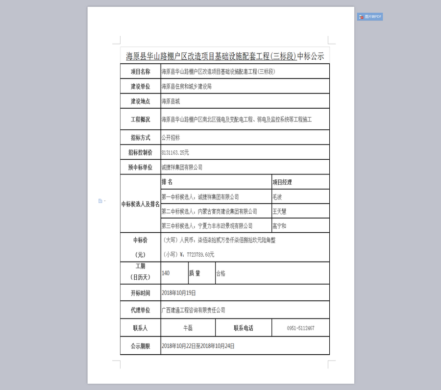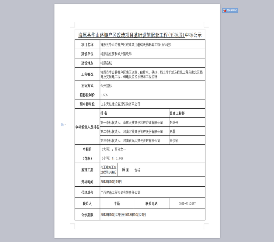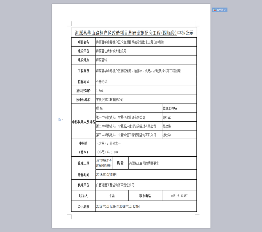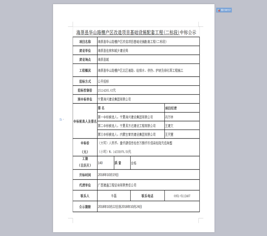 海原县华山路棚户区改造项目基础设施配套工程中标公示
