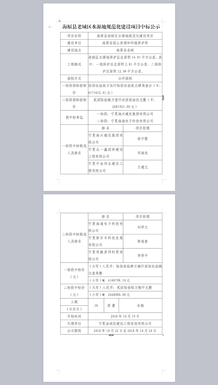海原县老城区水源地规范化建设项目中标公示