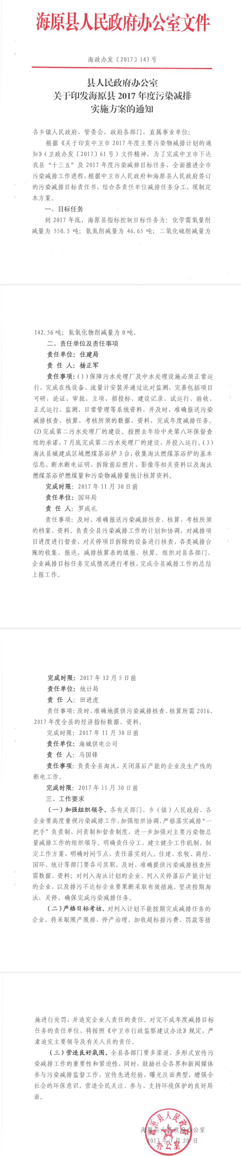 县人民政府办公室关于印发海原县2017年污染物减排实施方案的通知
