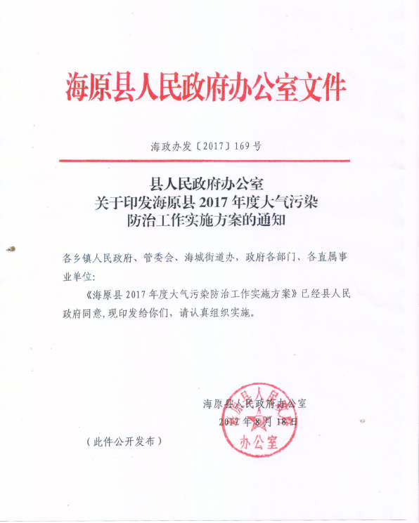 县人民政府办公室关于印发海原县2017年大气污染防治工作实施方案的通知