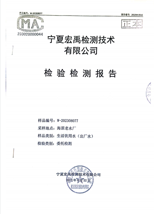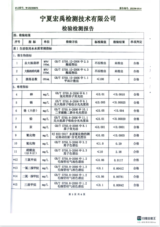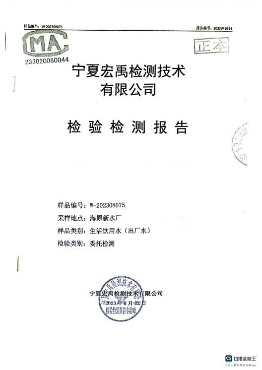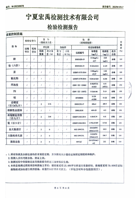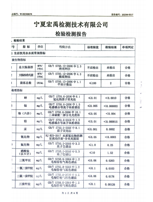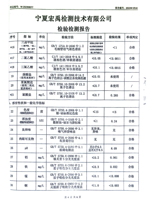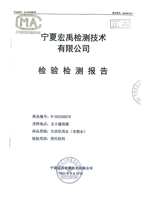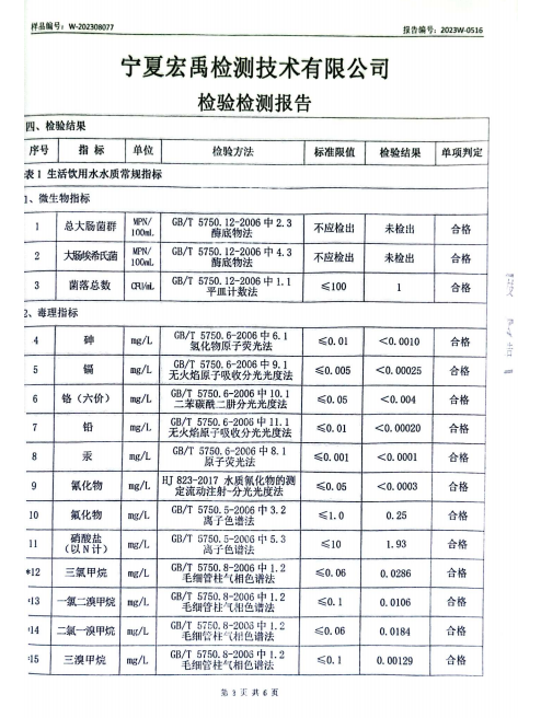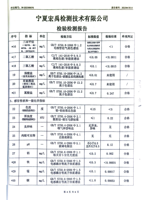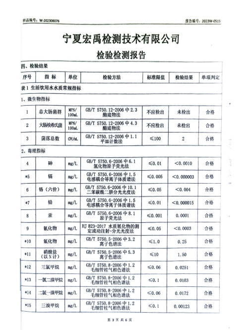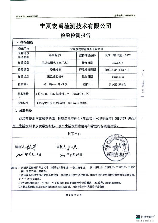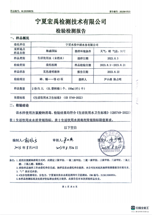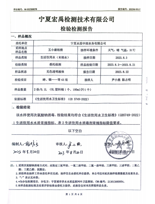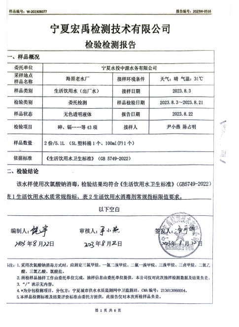 海原县2023年8月份自来水水质检验检测报告