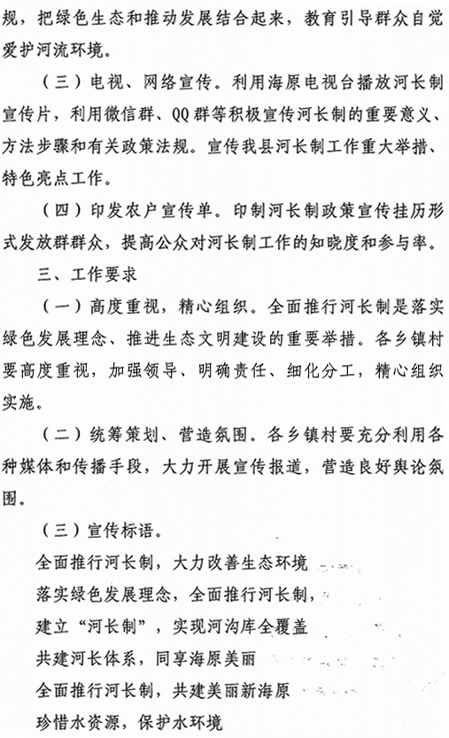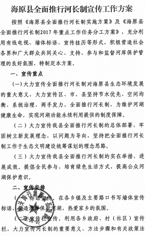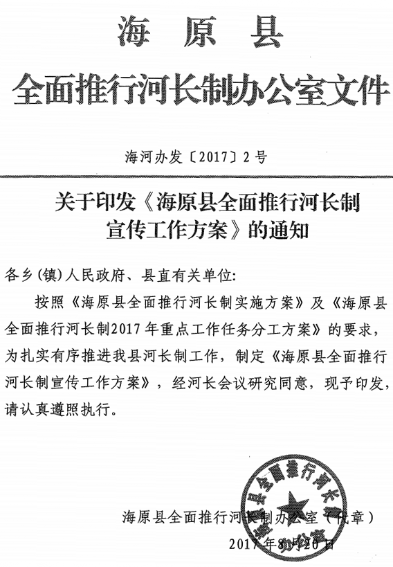 关于印发《海原县全面推行河长制宣传工作方案》的通知