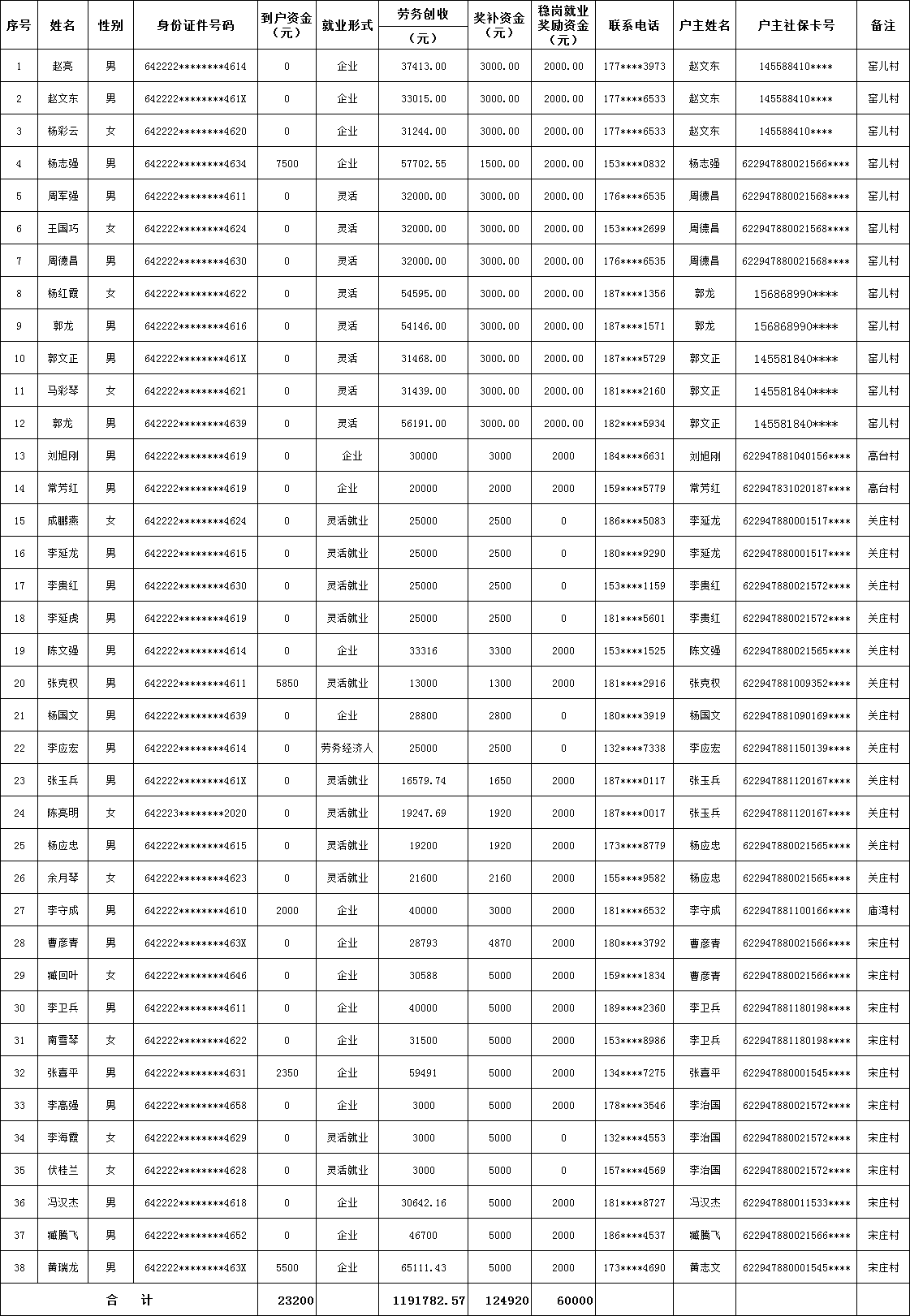 海原县关庄乡2022年贫困劳动力转移就业奖励补贴花名册