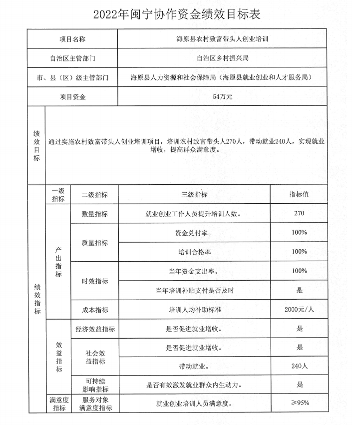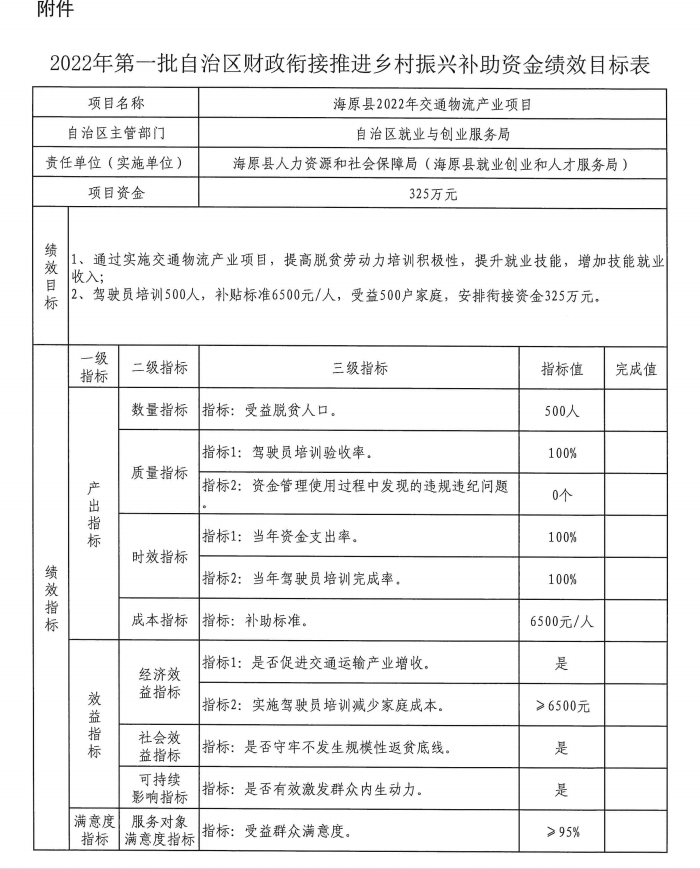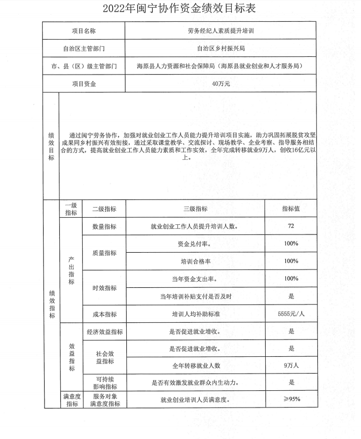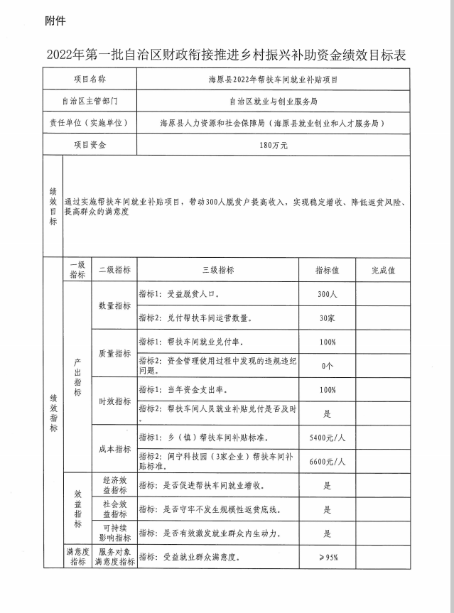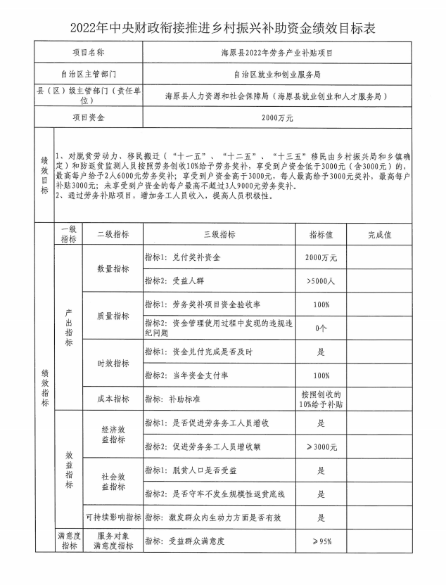 2022年中央财政衔接推挤乡村振兴补助资金绩效目标表