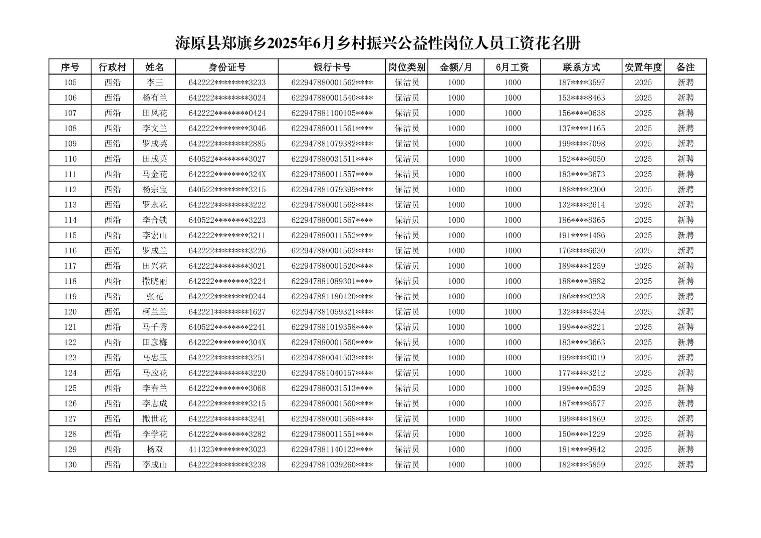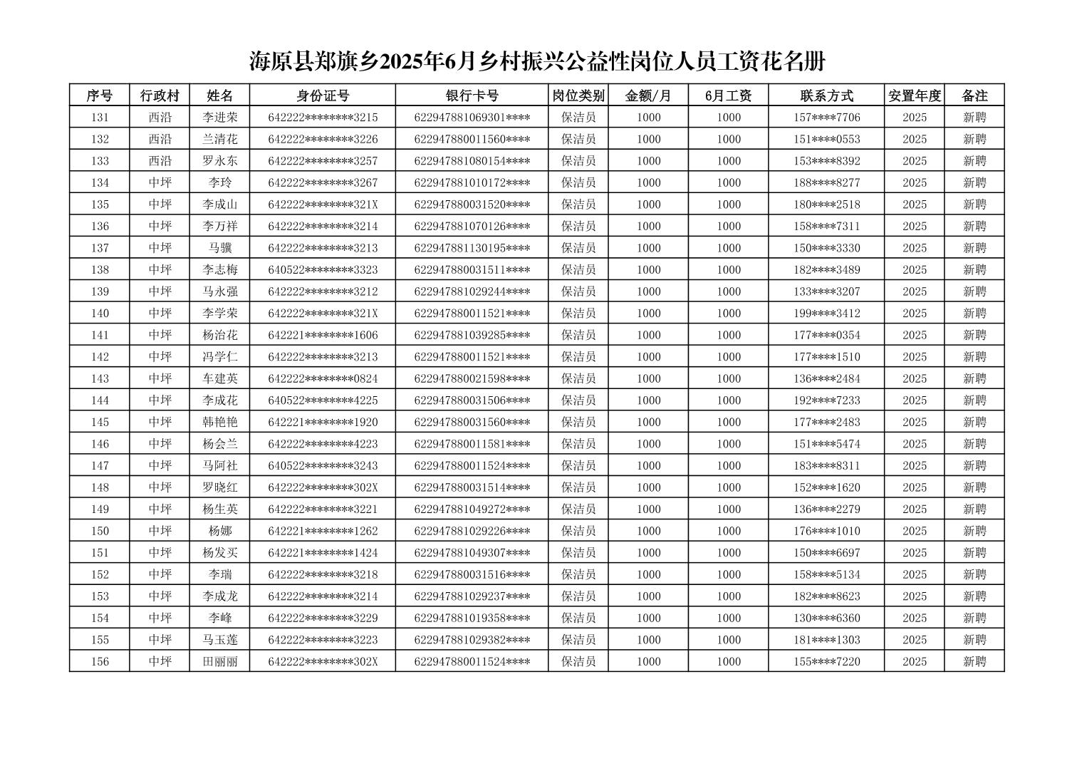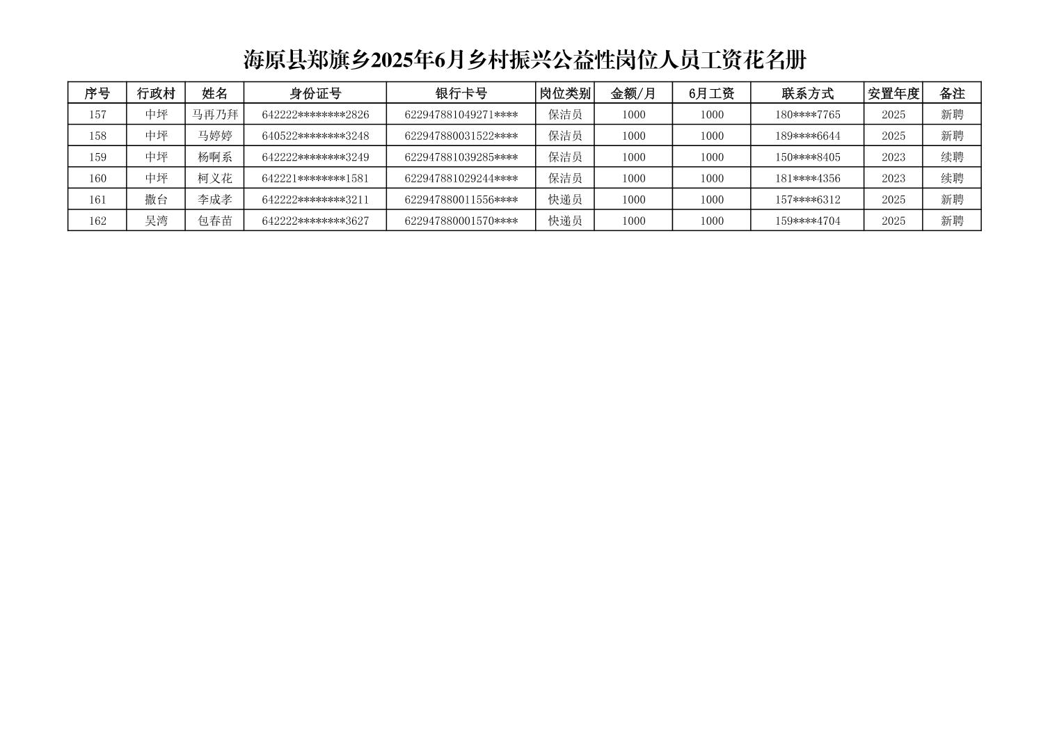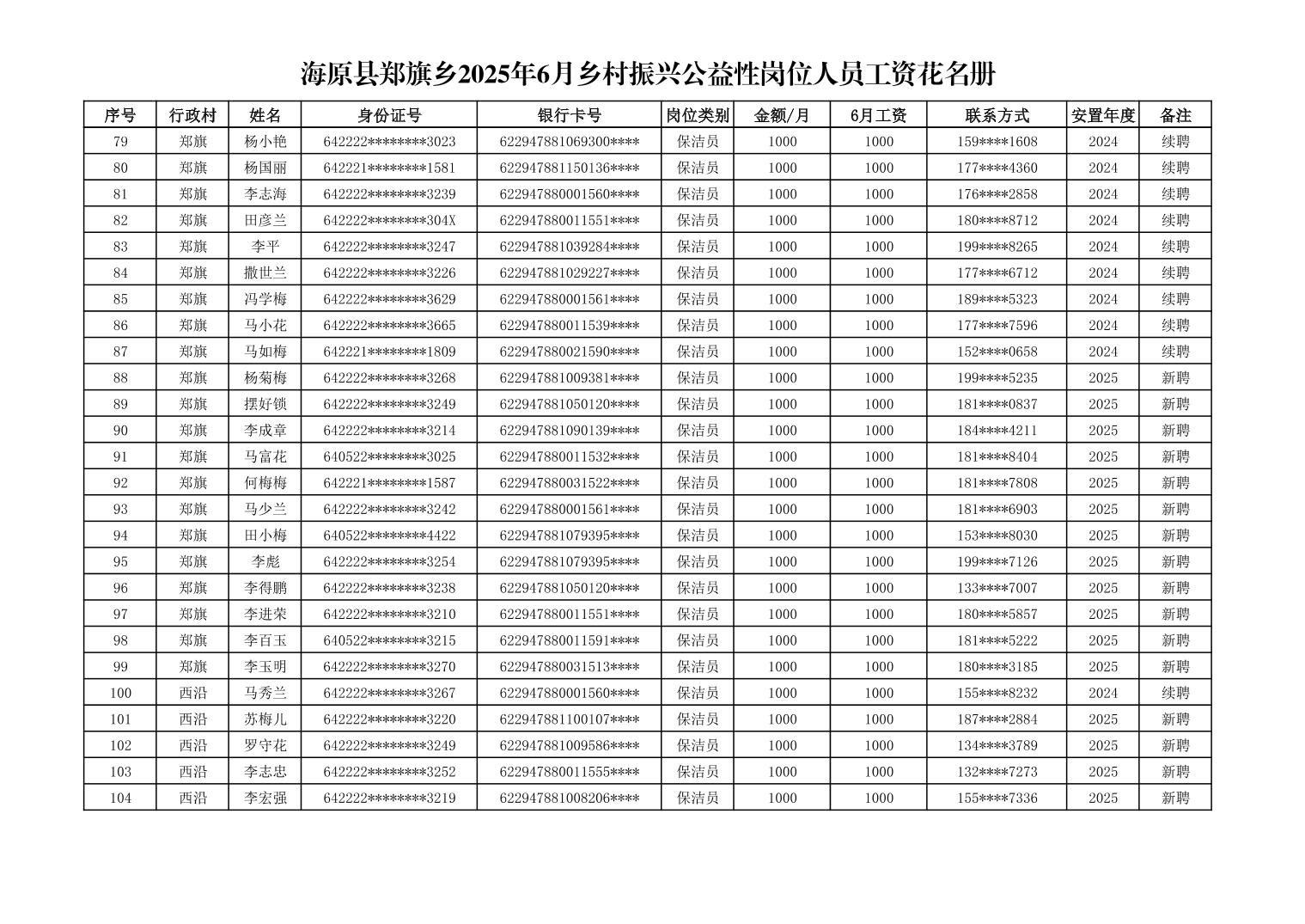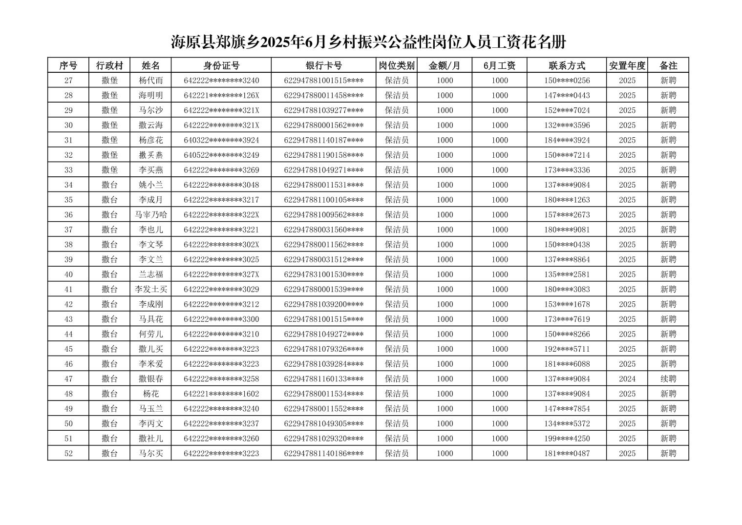 海原县郑旗乡2025年6月乡村振兴公益性岗位人员工资花名册