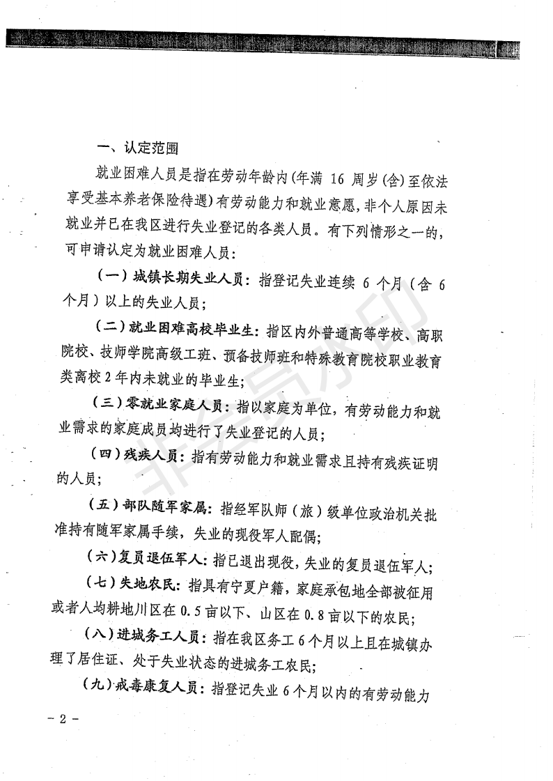 8、进城务工人员:指在我区务工6个月以上且在城镇办理了居住证、处于失业状态的进城务工农民。认定材料:①《宁夏就业困难人员认定申请表》;②务工6个月以上相关证明复印件(如工资流水、雇主出具雇用证明等),缴纳职工社保6个月以上的人员无需提供此项材料;③长期在城镇居住的农村户籍人员附居住证(公安局办理),无法办理居住证的可附租房合同或房产证(房屋所在地为城镇区域)复印件,非农或城镇户籍人员无需提供该项材料。
