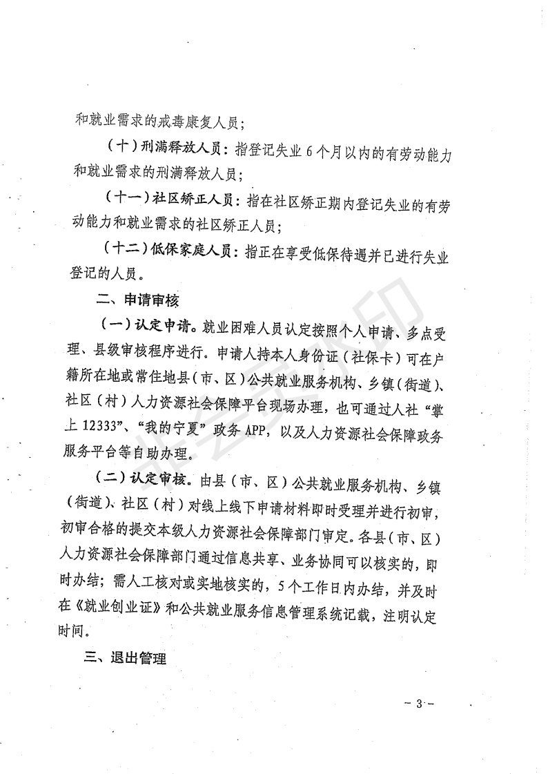 12、低保家庭人员:指正在享受低保待遇并已进行失业登记的人员(必须是享受低保待遇本人)。认定材料:①《宁夏就业困难人员认定申请表》;②低保证复印件。(办理程序见文末)