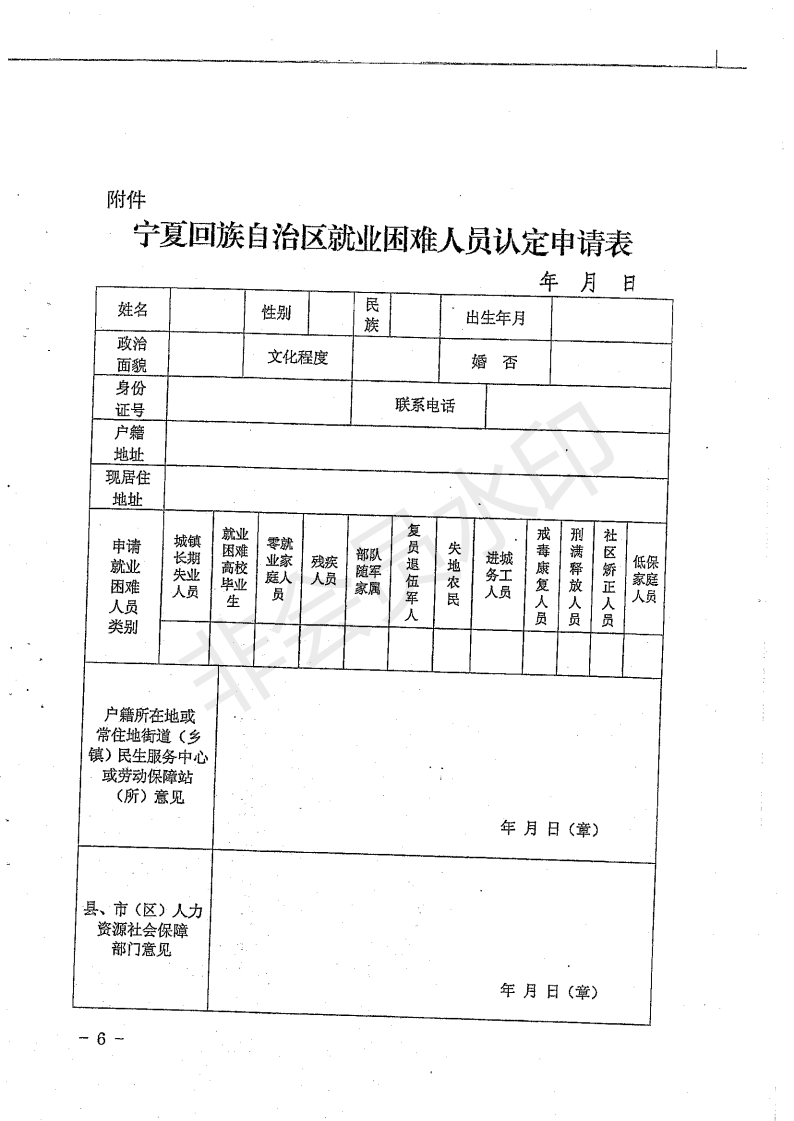 6、复员退伍军人:指已退出现役,失业的复员退伍军人。认定材料:①《宁夏就业困难人员认定申请表》;②退役军人证复印件。(办理程序见文末)