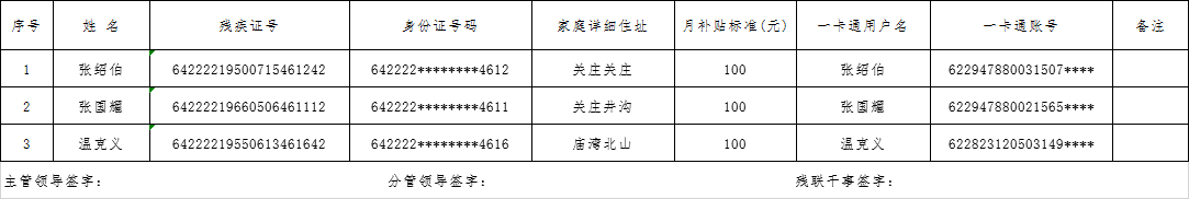 海原县关庄乡2020年3月份残疾人生活补贴增加花名册