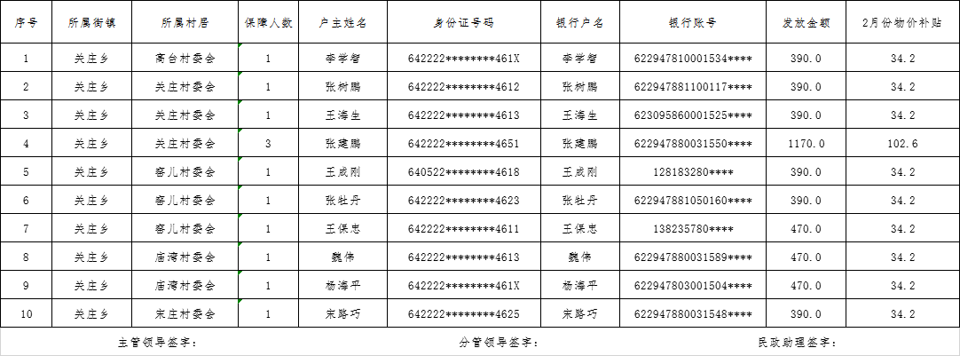 海原县关庄乡2020年04月城市最低生活保障资金发放册
