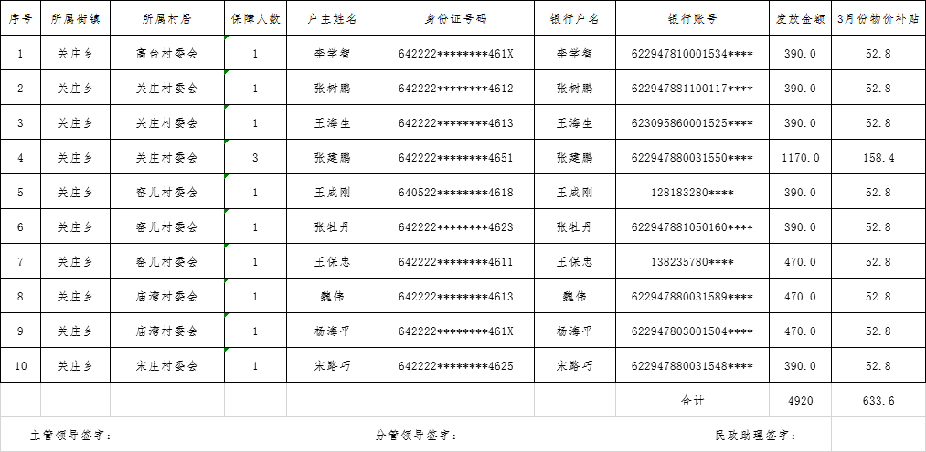 海原县关庄乡2020年05月城市最低生活保障资金发放册
