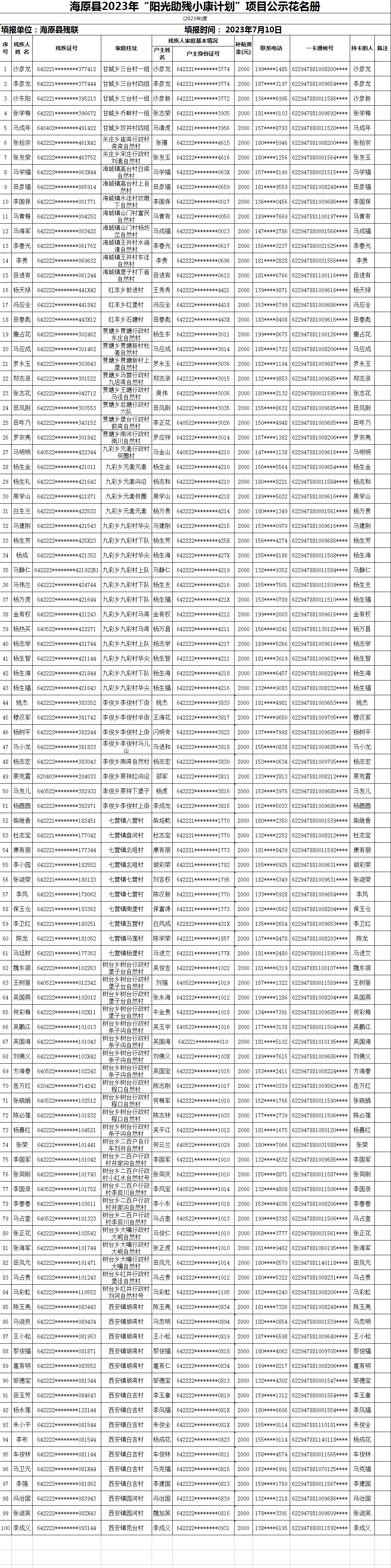 海原县2023年“阳光助残小康计划”项目公示花名册