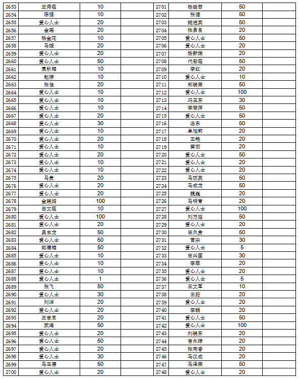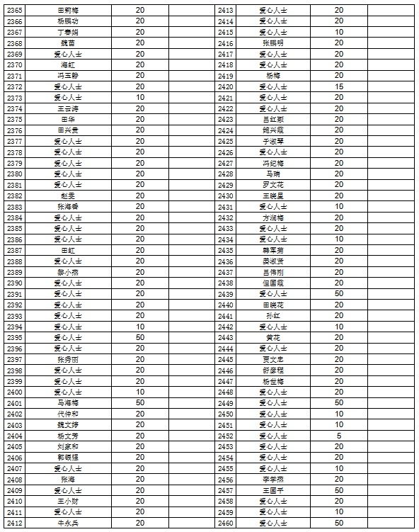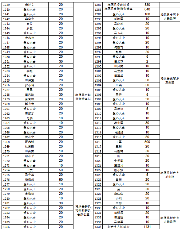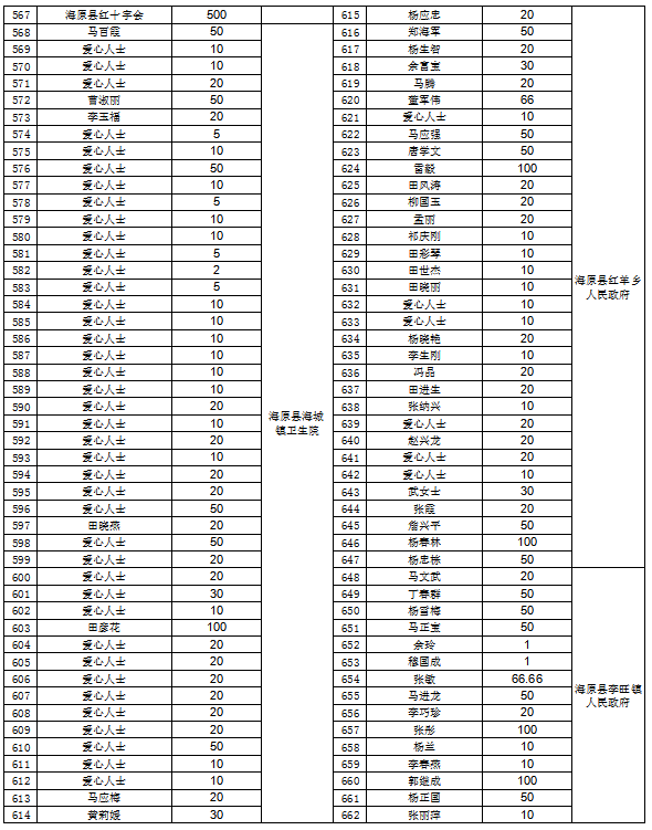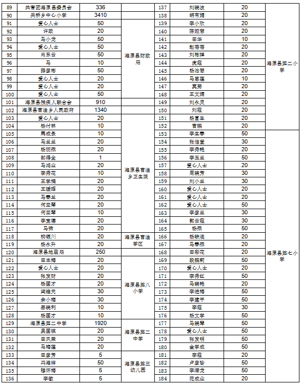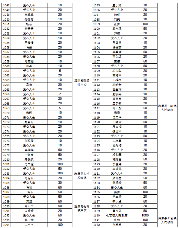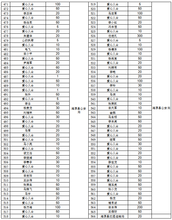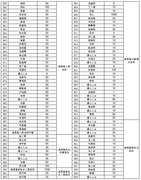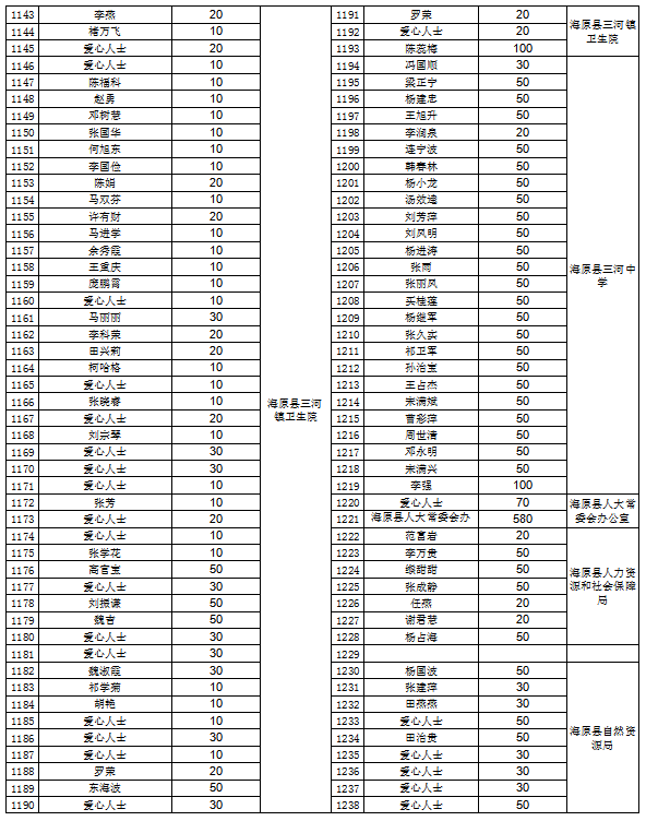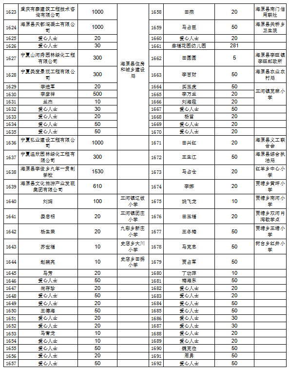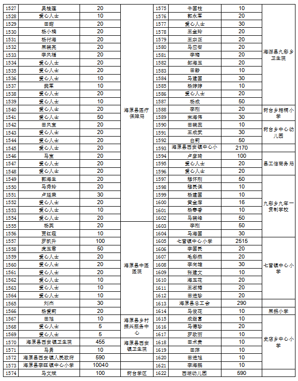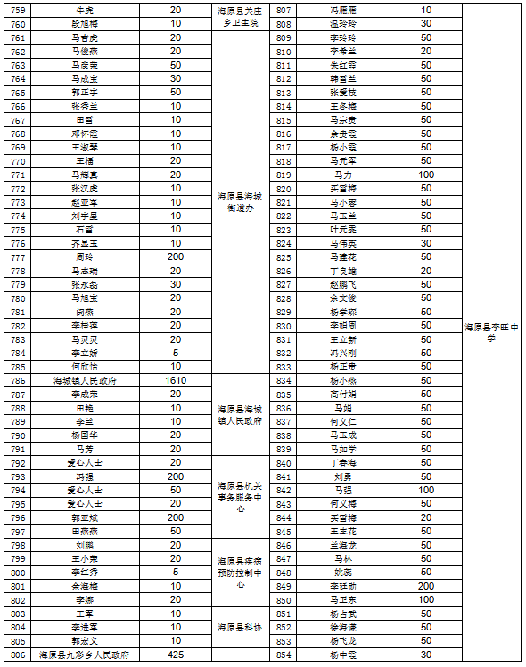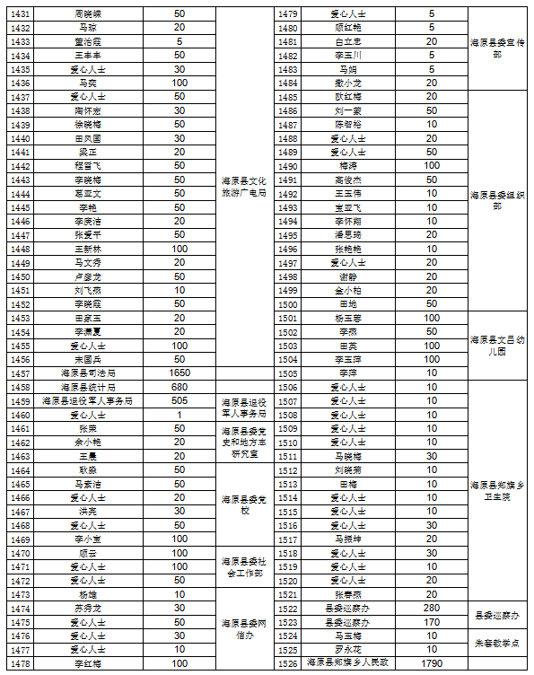 备注:因部分单位干部职工捐款时未注明所在单位,无法归口,为方便统计和公示,全部列入个人及爱心人士进行公示,如对公示内容有异议,请到县红十字会或致电红十字会查询,联系电话:0955-8796777。