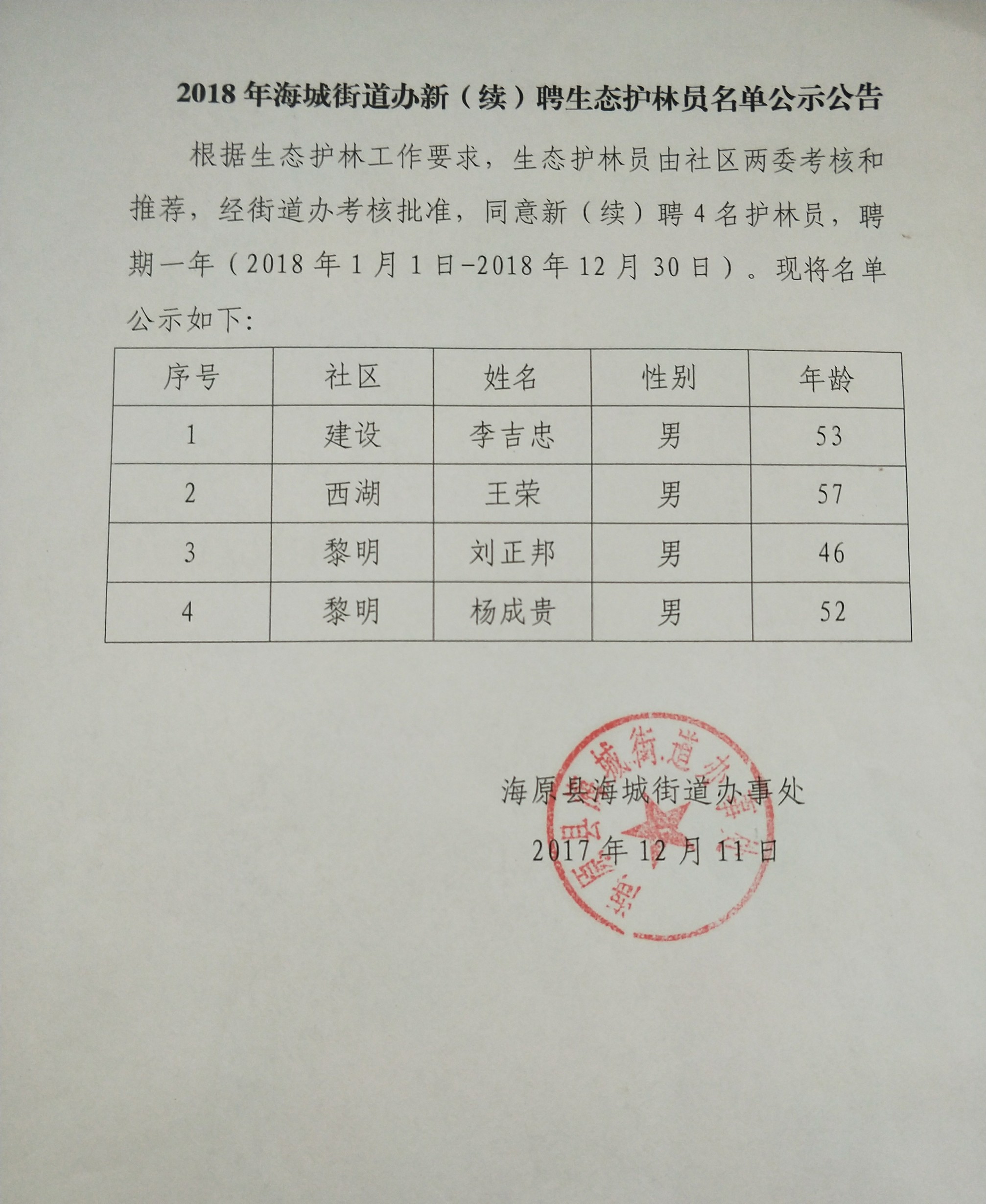 2018年海城街道办新(续)聘生态护林员名单公示公告