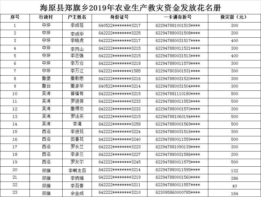 海原县郑旗乡2019年农业生产救灾资金发放花名册
