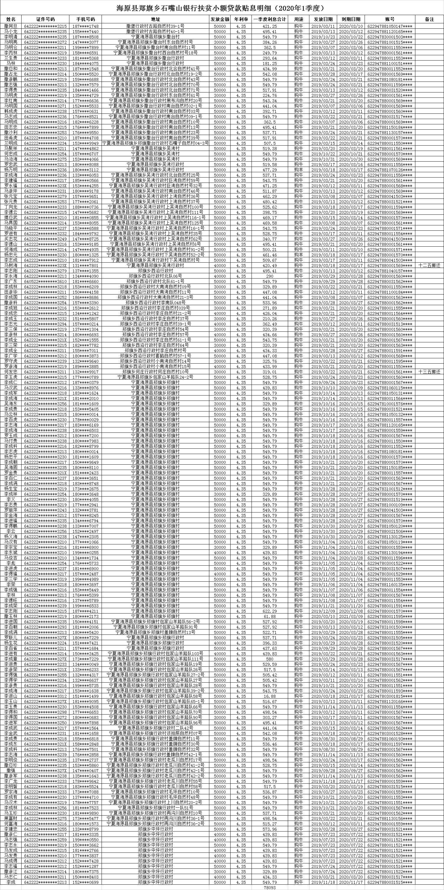 海原县郑旗乡石嘴山银行扶贫小额贷款贴息明细(2020年1季度)