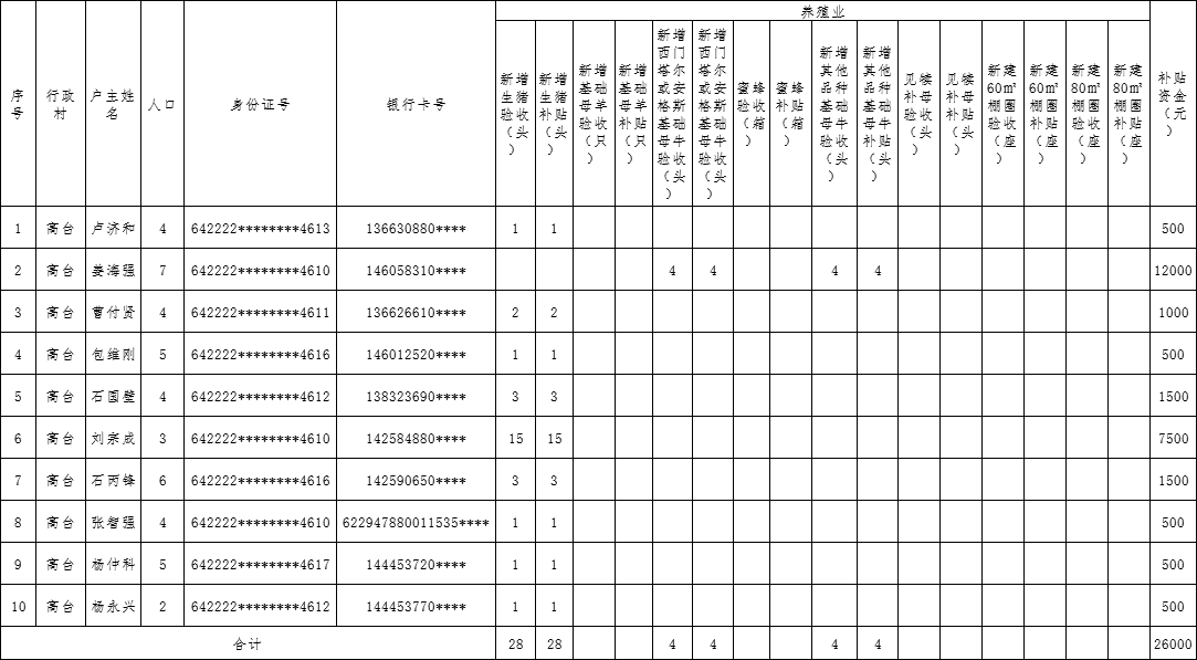 海原县关庄乡高台村2020年养殖业产业验收补贴花名册