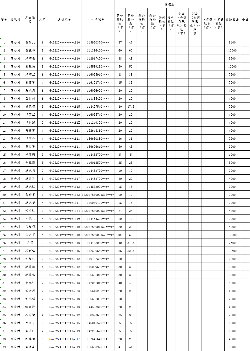 海原县关庄乡高台村2020年种植业产业验收补贴花名册