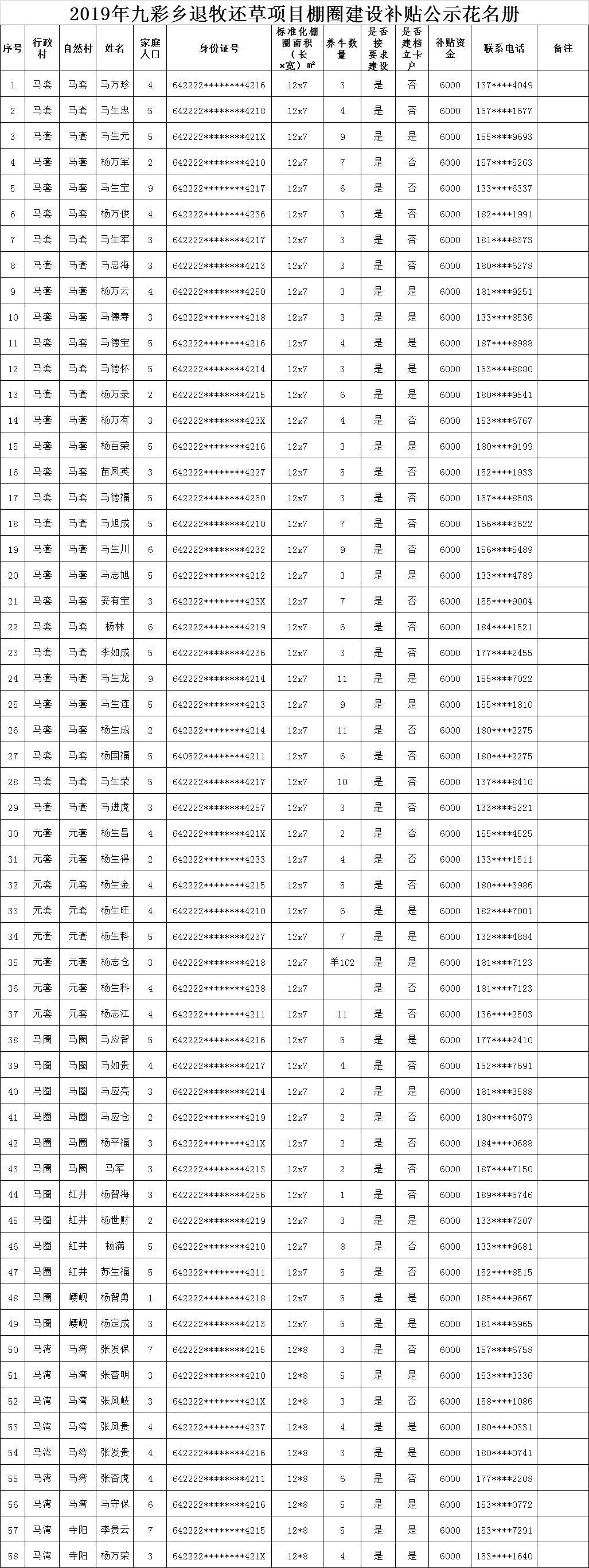 海原县九彩乡2019年退牧还草项目棚圈建设补贴公示花名册