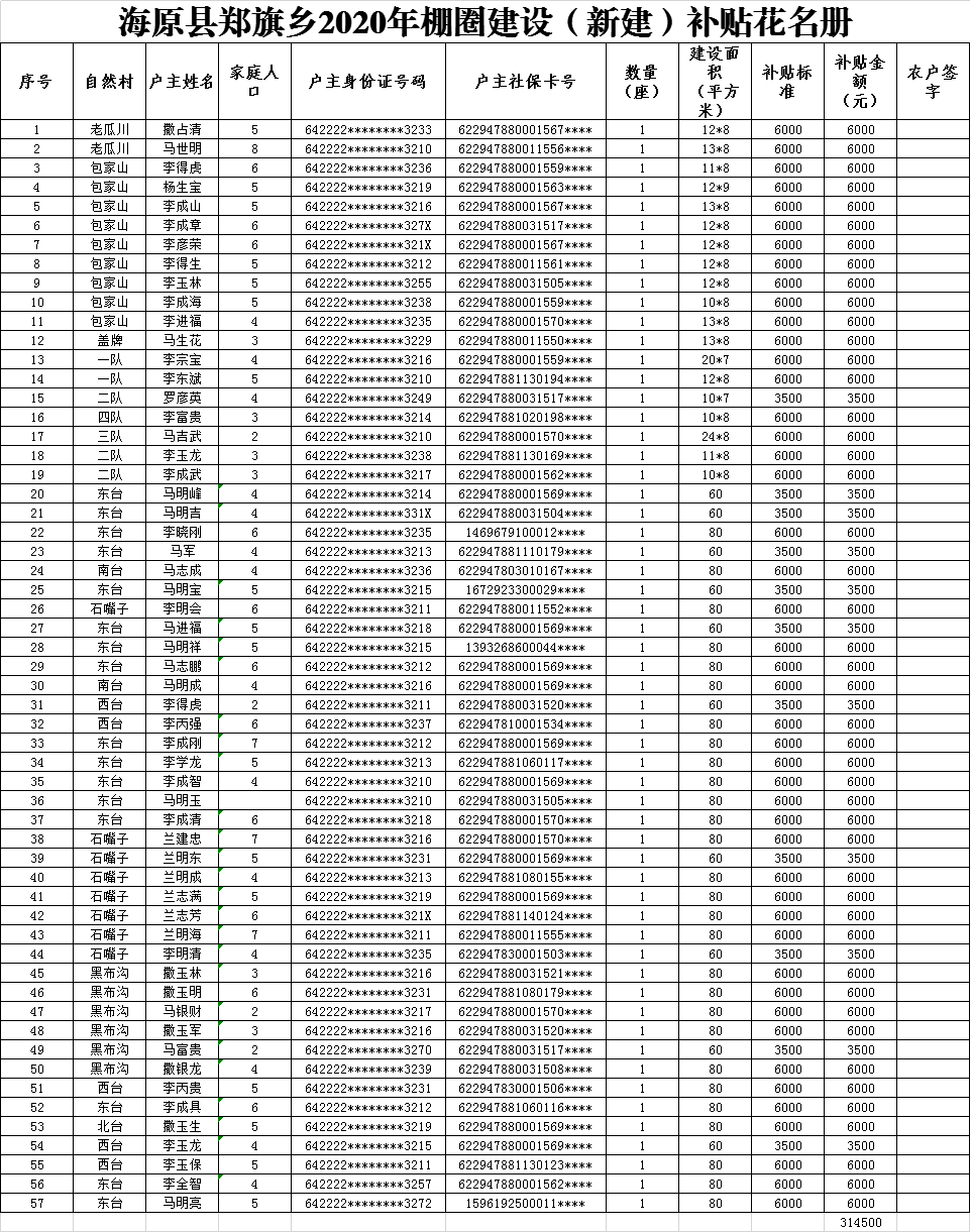 海原县郑旗乡2020年棚圈建设(新建)补贴花名册