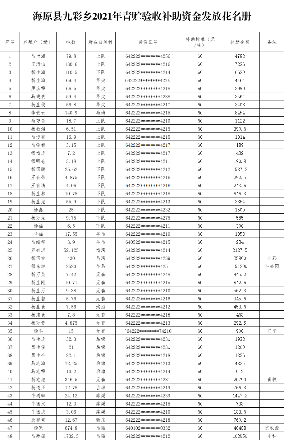 海原县九彩乡2021年青贮验收补助资金发放花名册