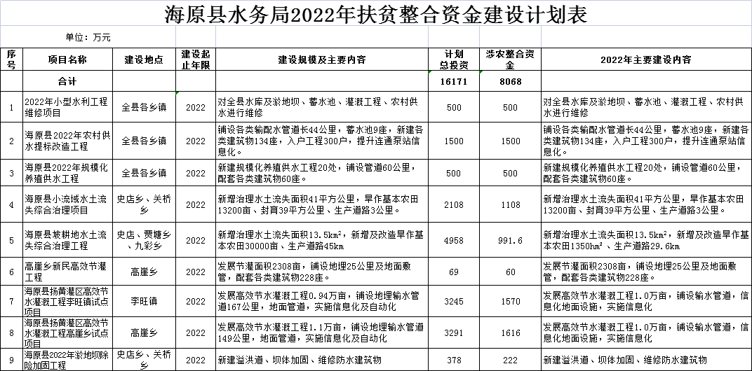 附件:海原县水务局2022年扶贫整合资金建设计划表