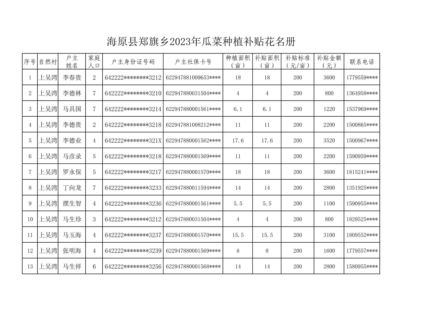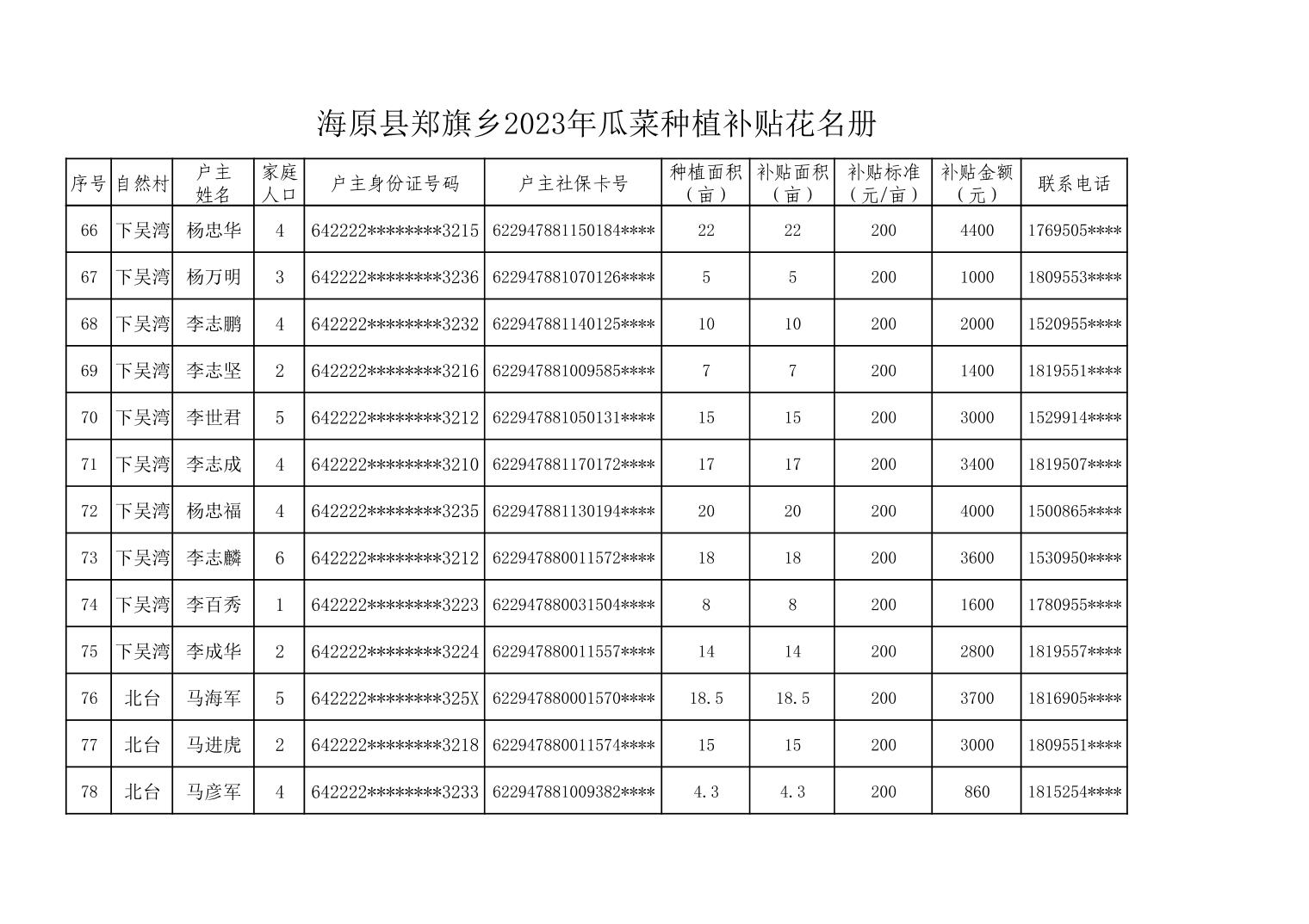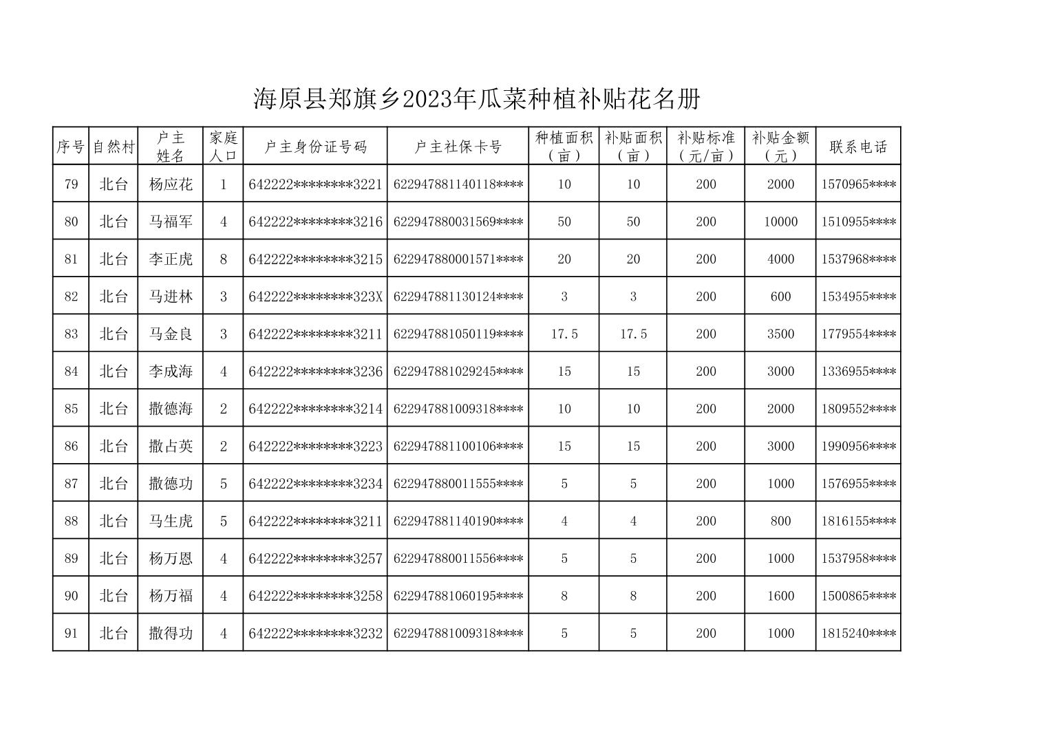 海原县郑旗乡2023年瓜菜种植补贴花名册