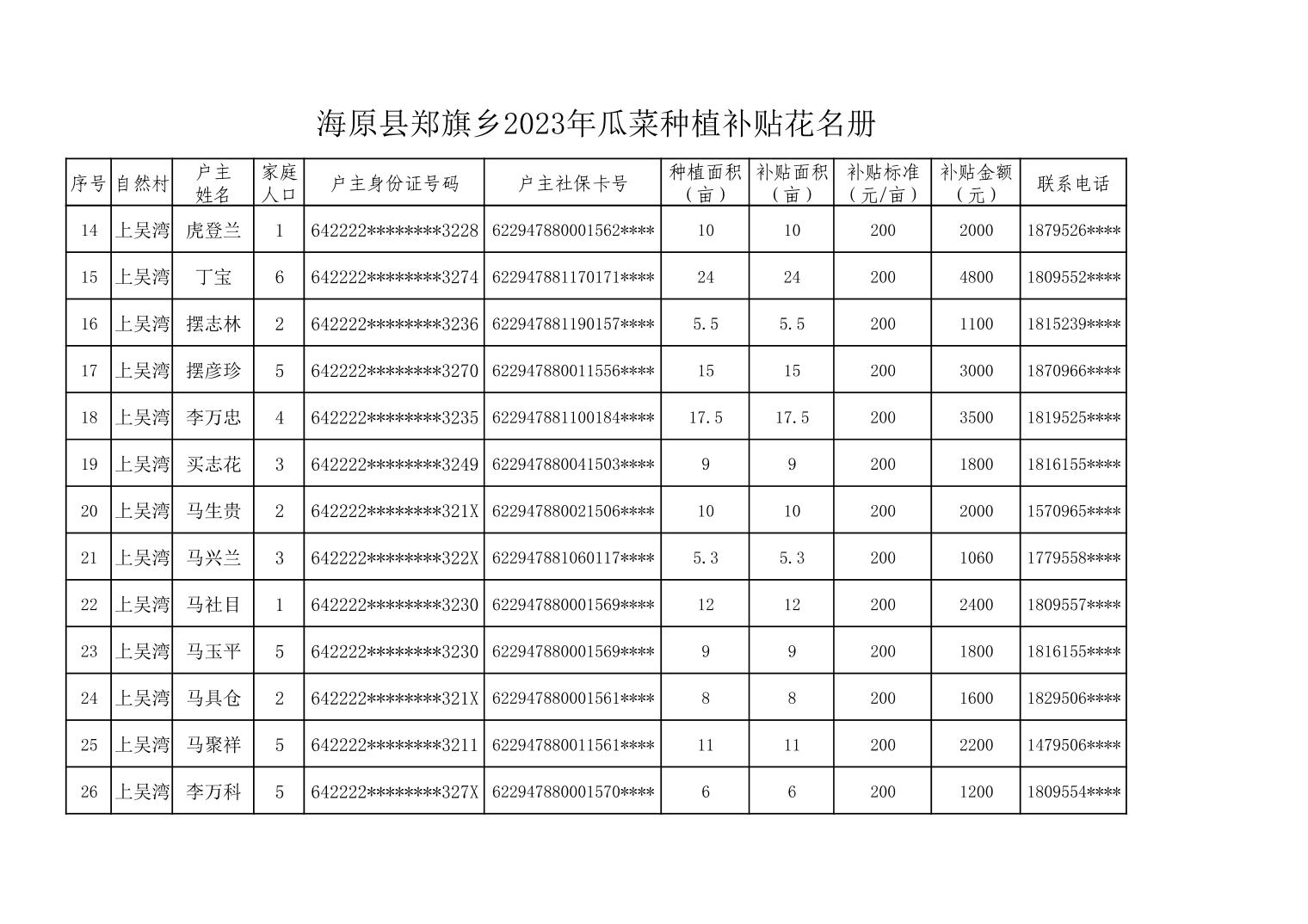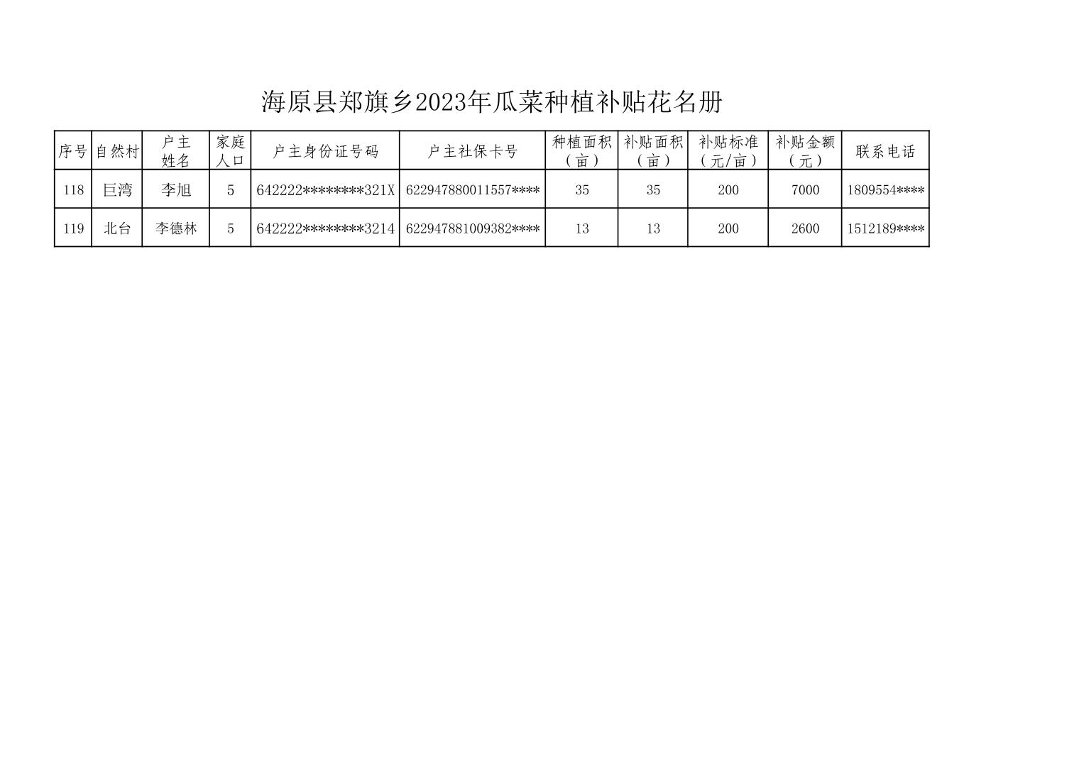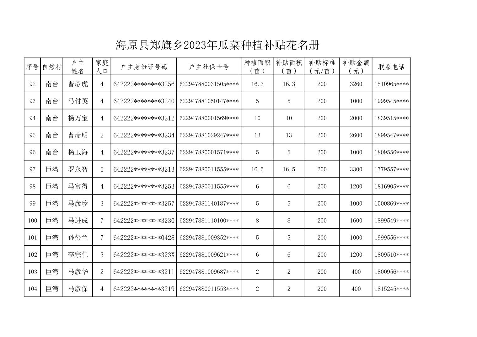 海原县郑旗乡2023年瓜菜种植补贴花名册