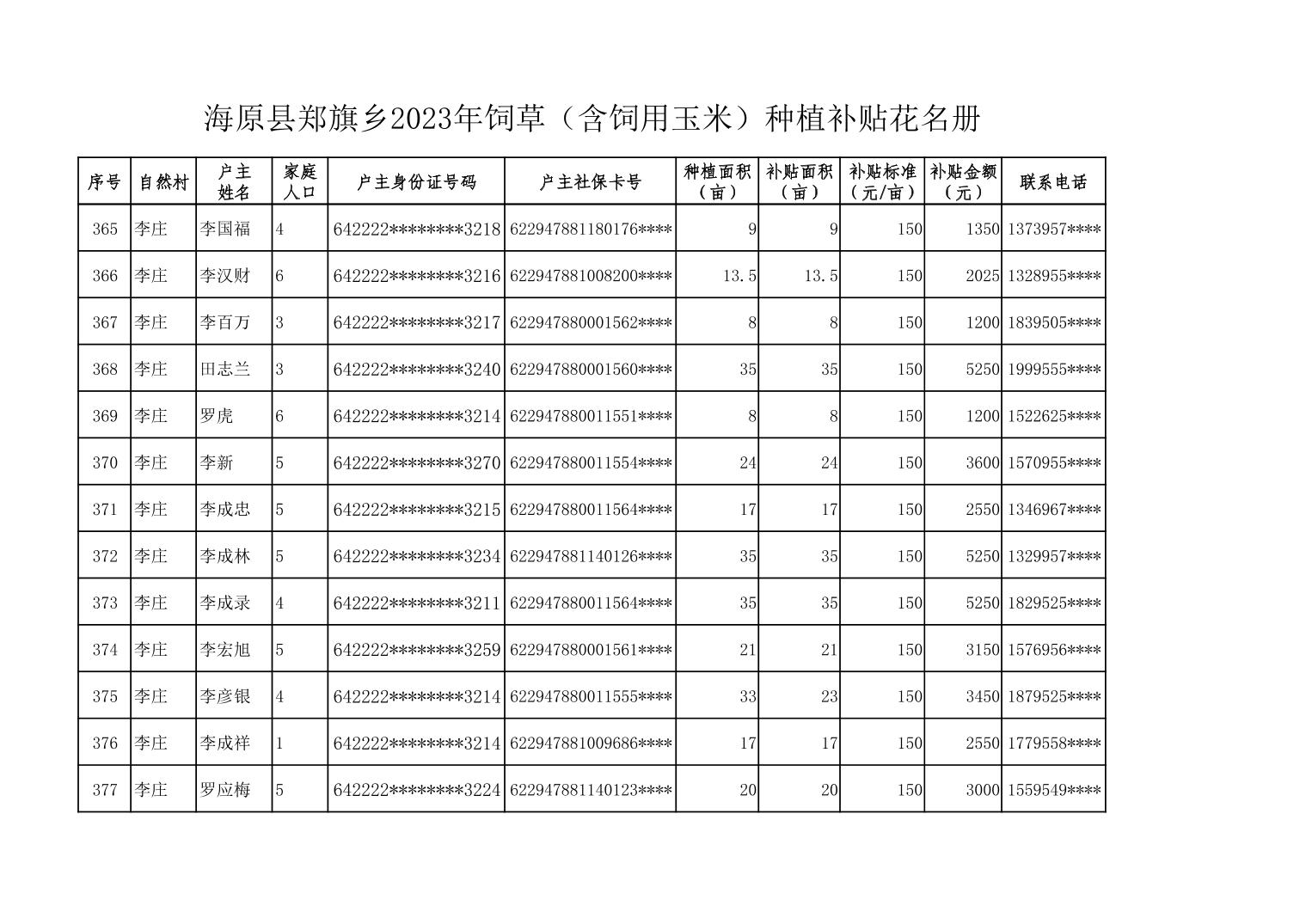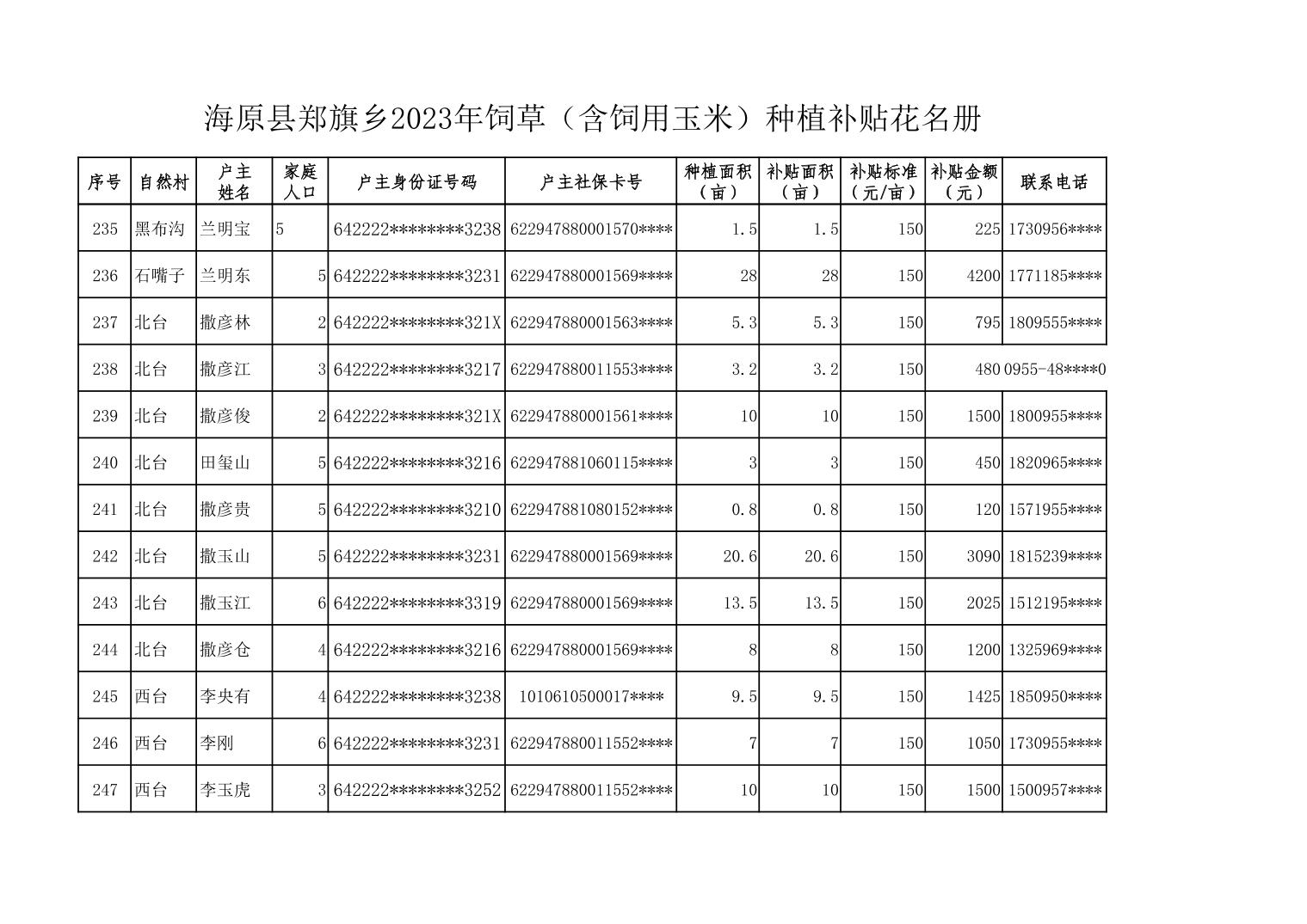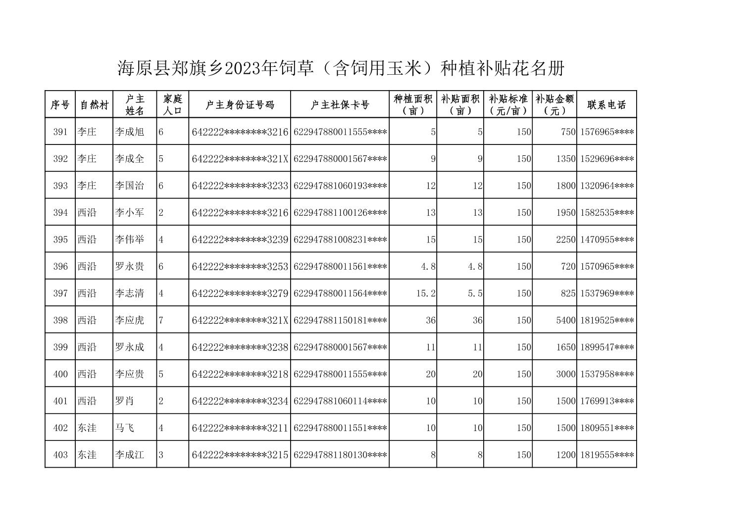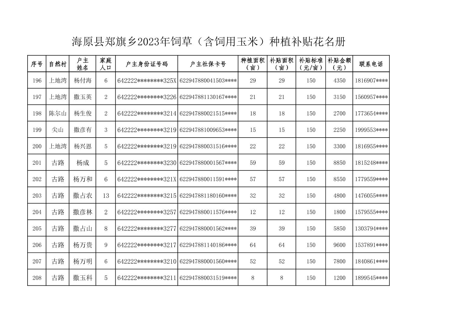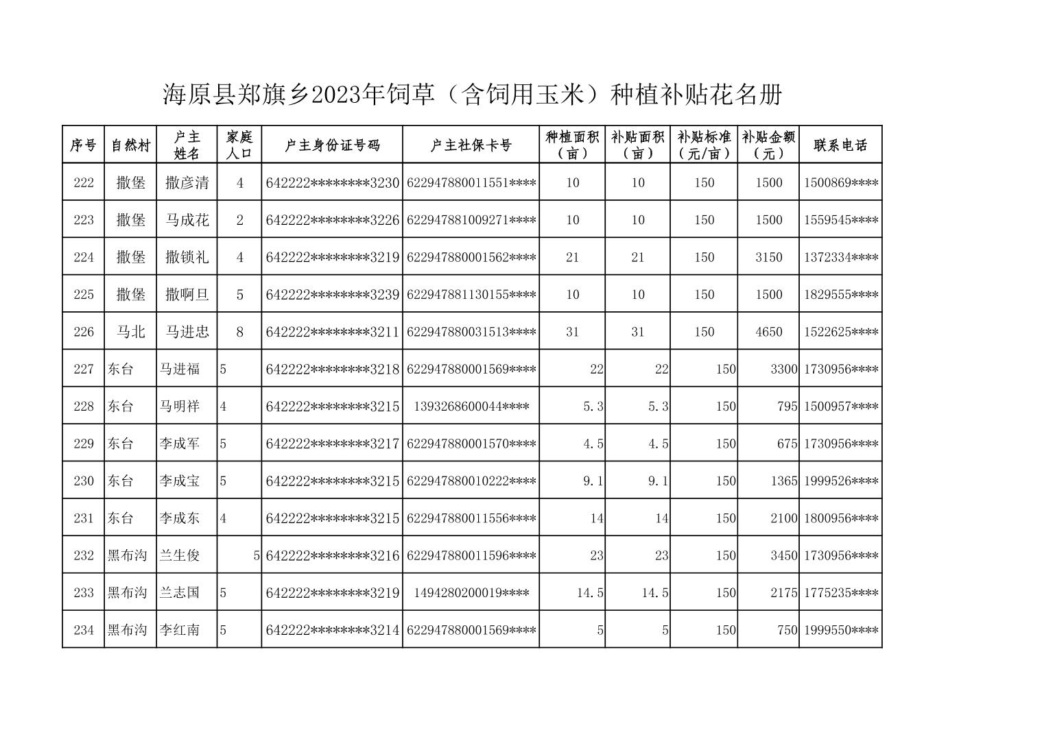 海原县郑旗乡2023年饲草(含饲用玉米)种植补贴花名册