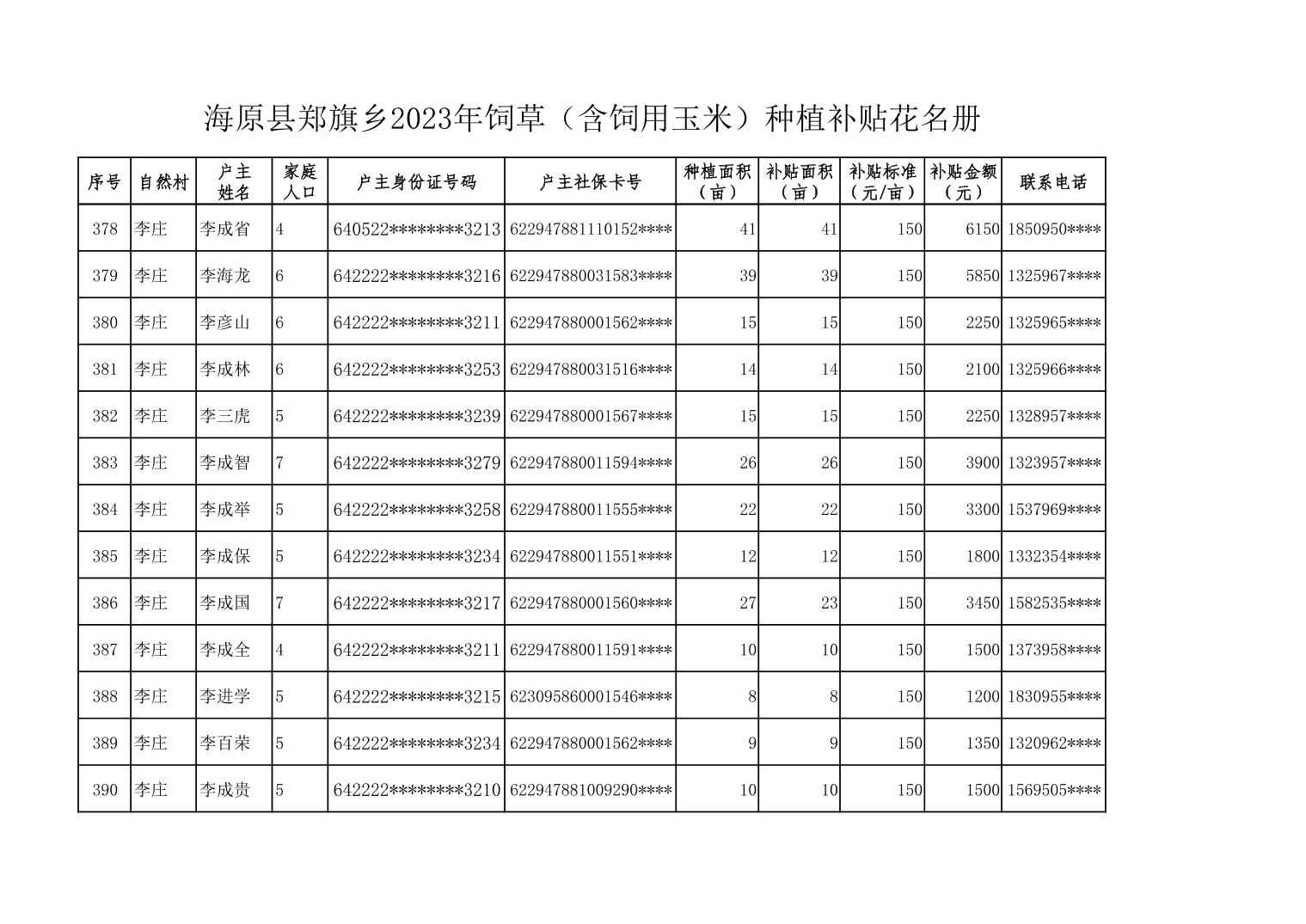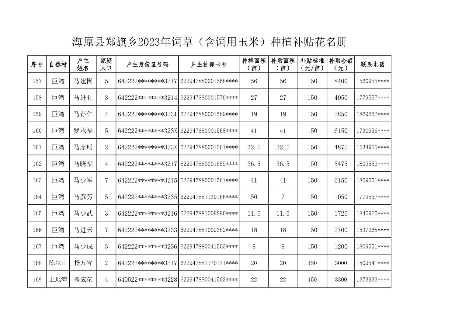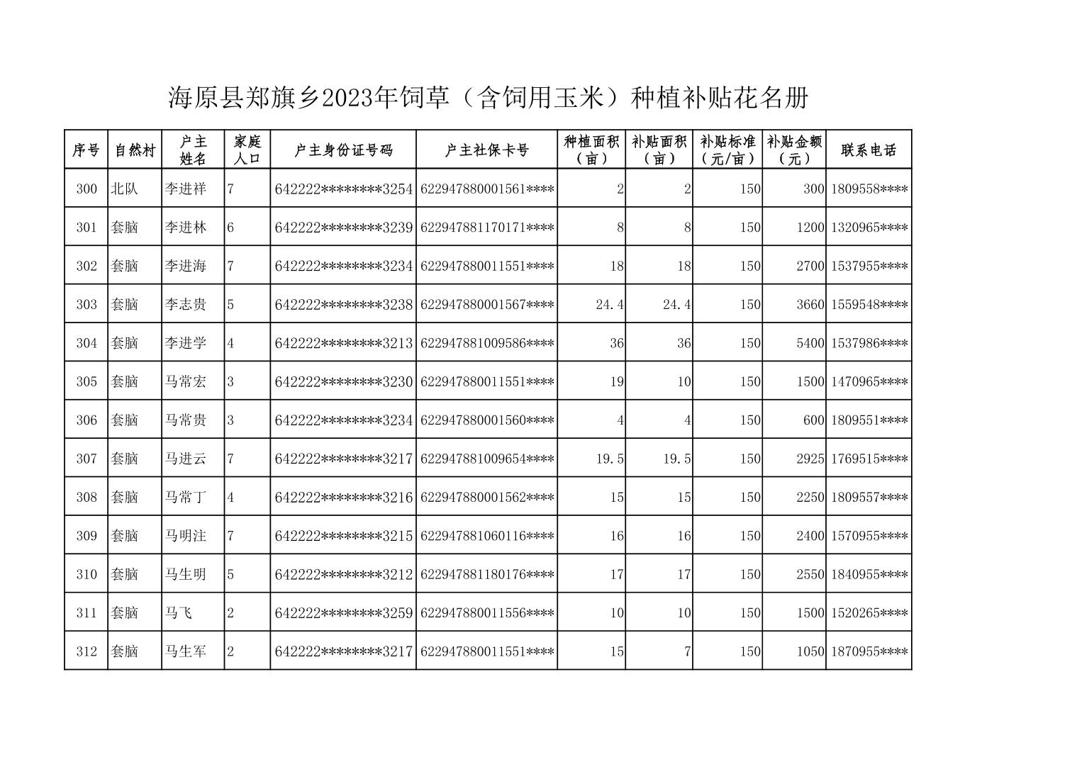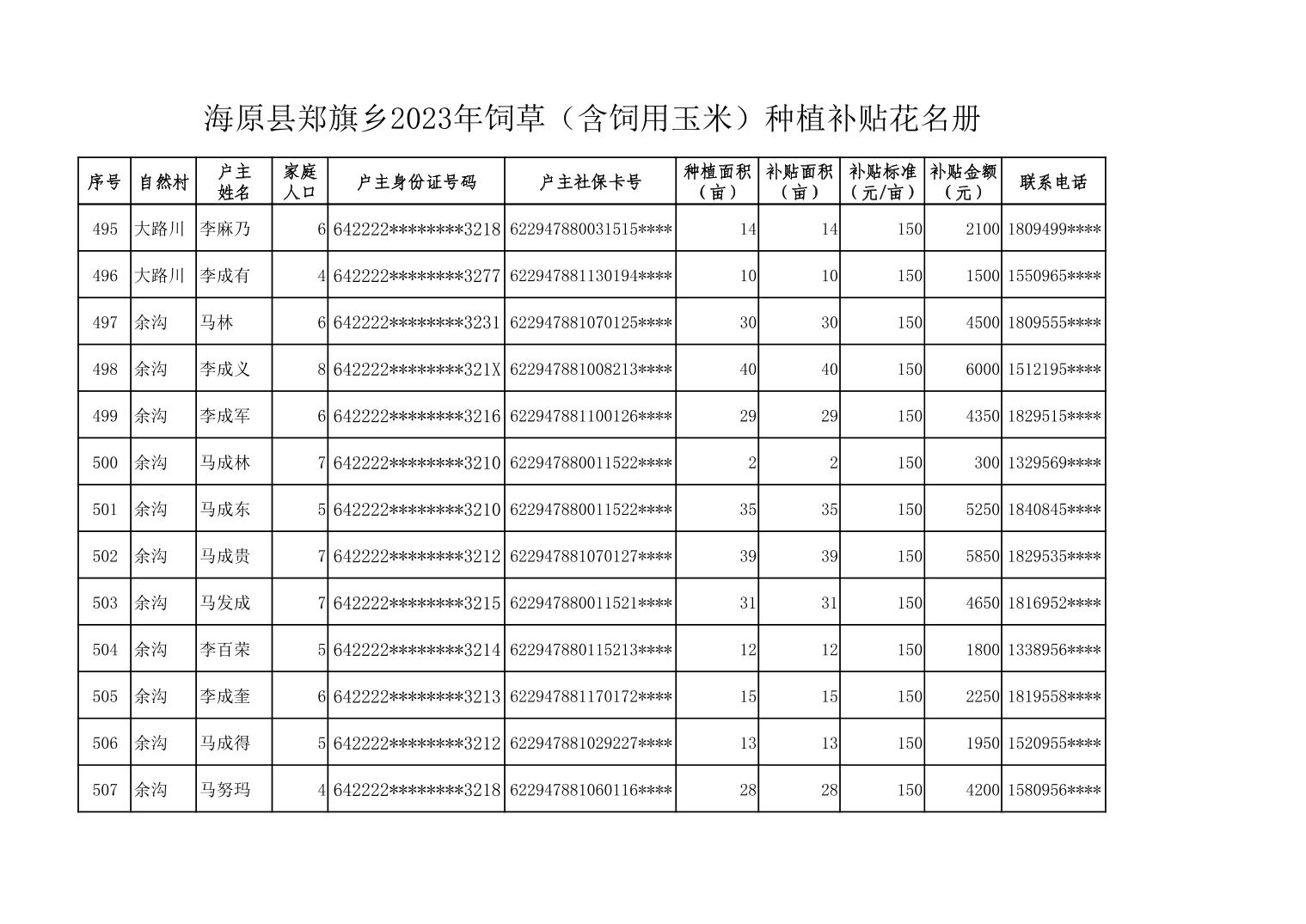 海原县郑旗乡2023年饲草(含饲用玉米)种植补贴花名册
