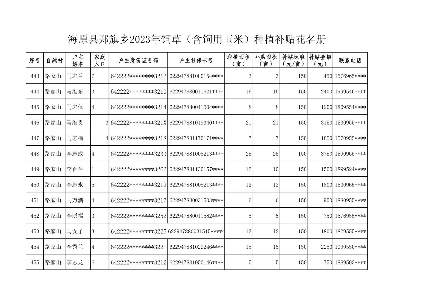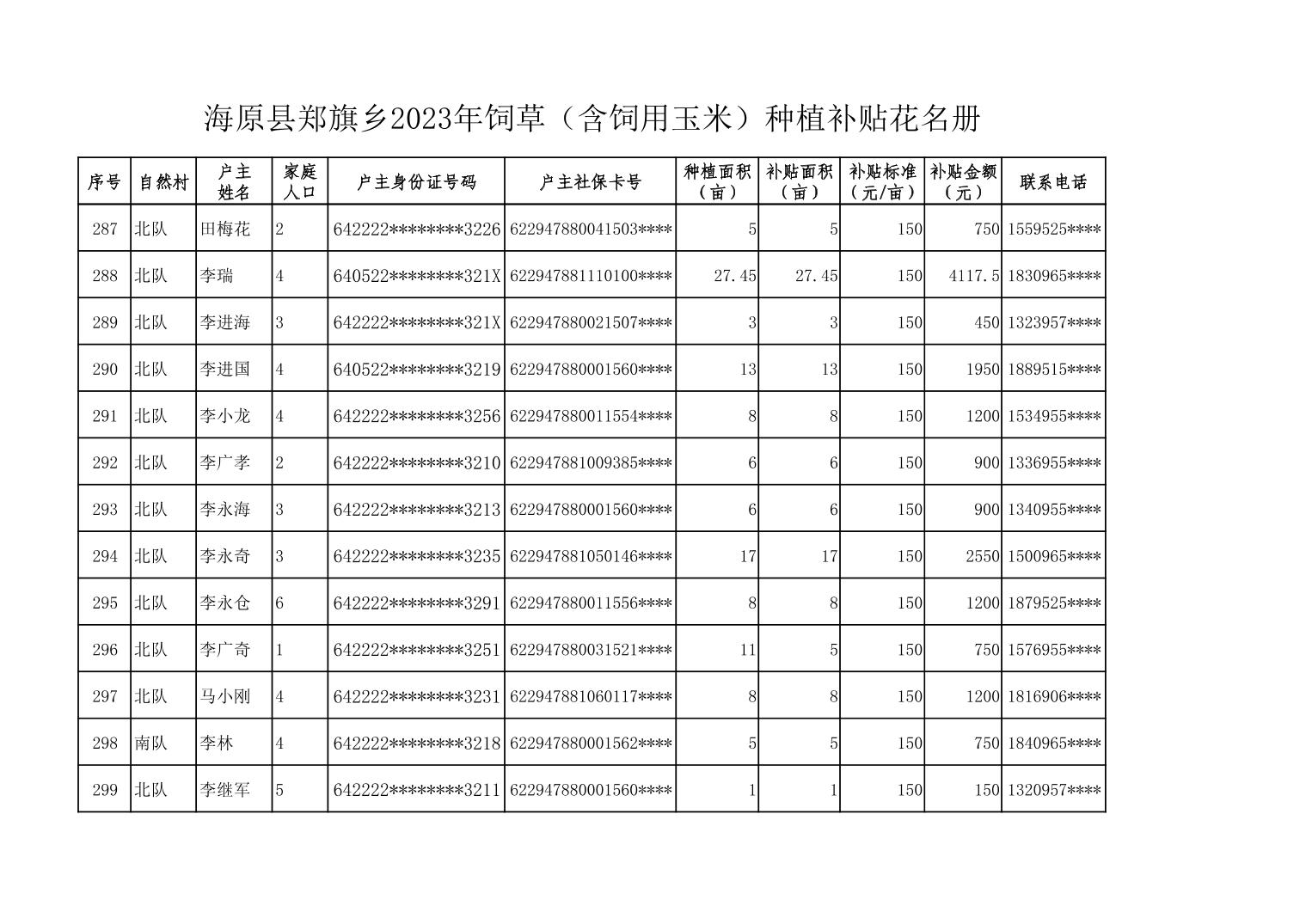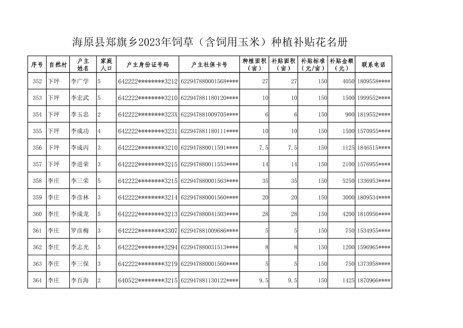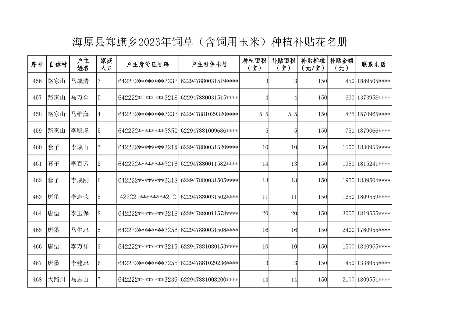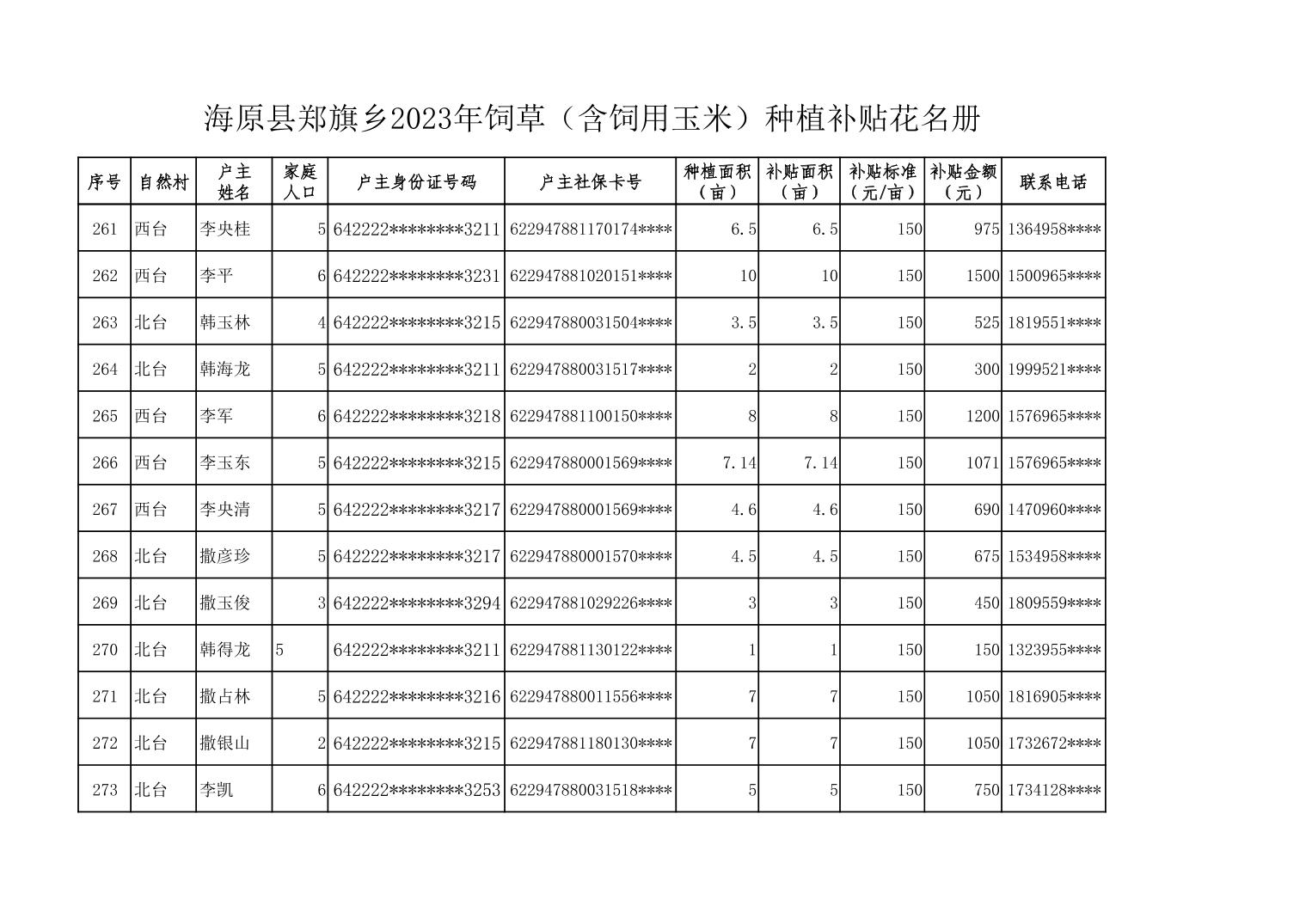 海原县郑旗乡2023年饲草(含饲用玉米)种植补贴花名册