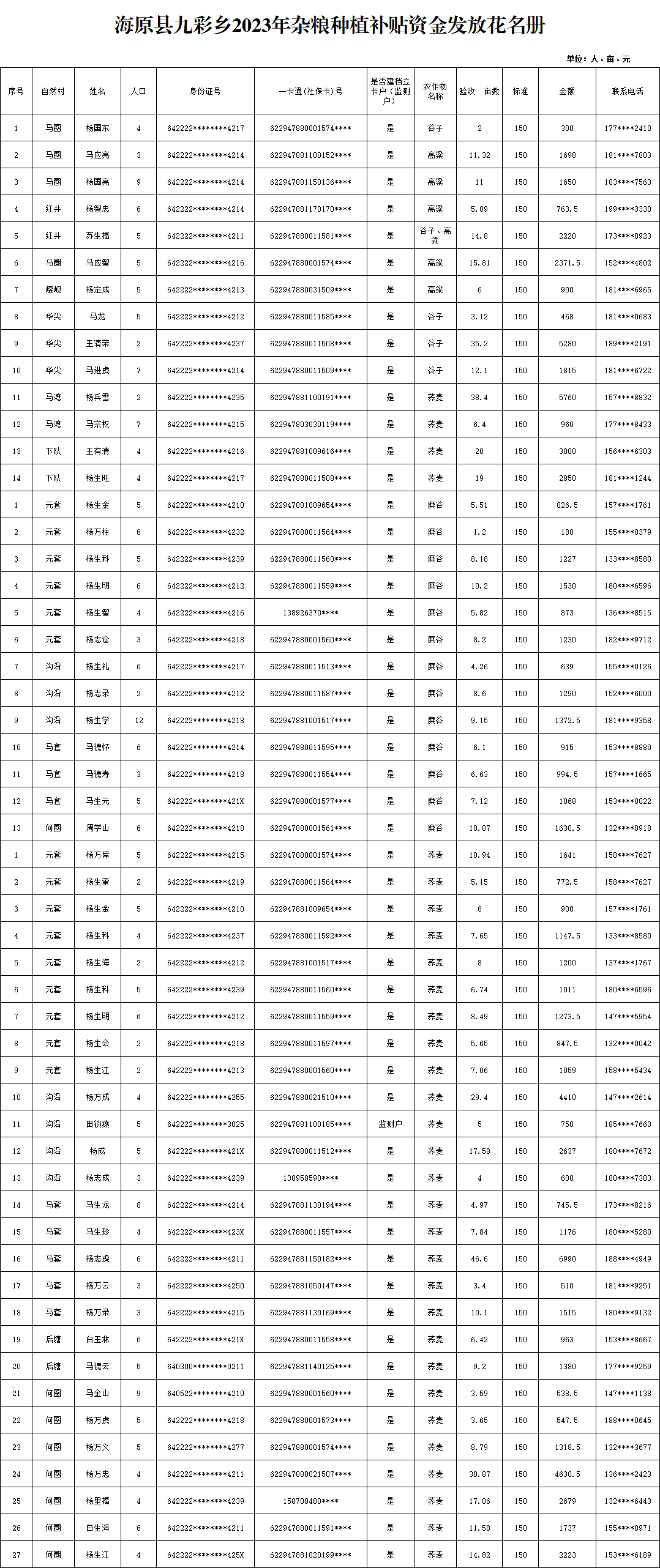 海原县九彩乡2023年杂粮种植补贴资金发放花名册