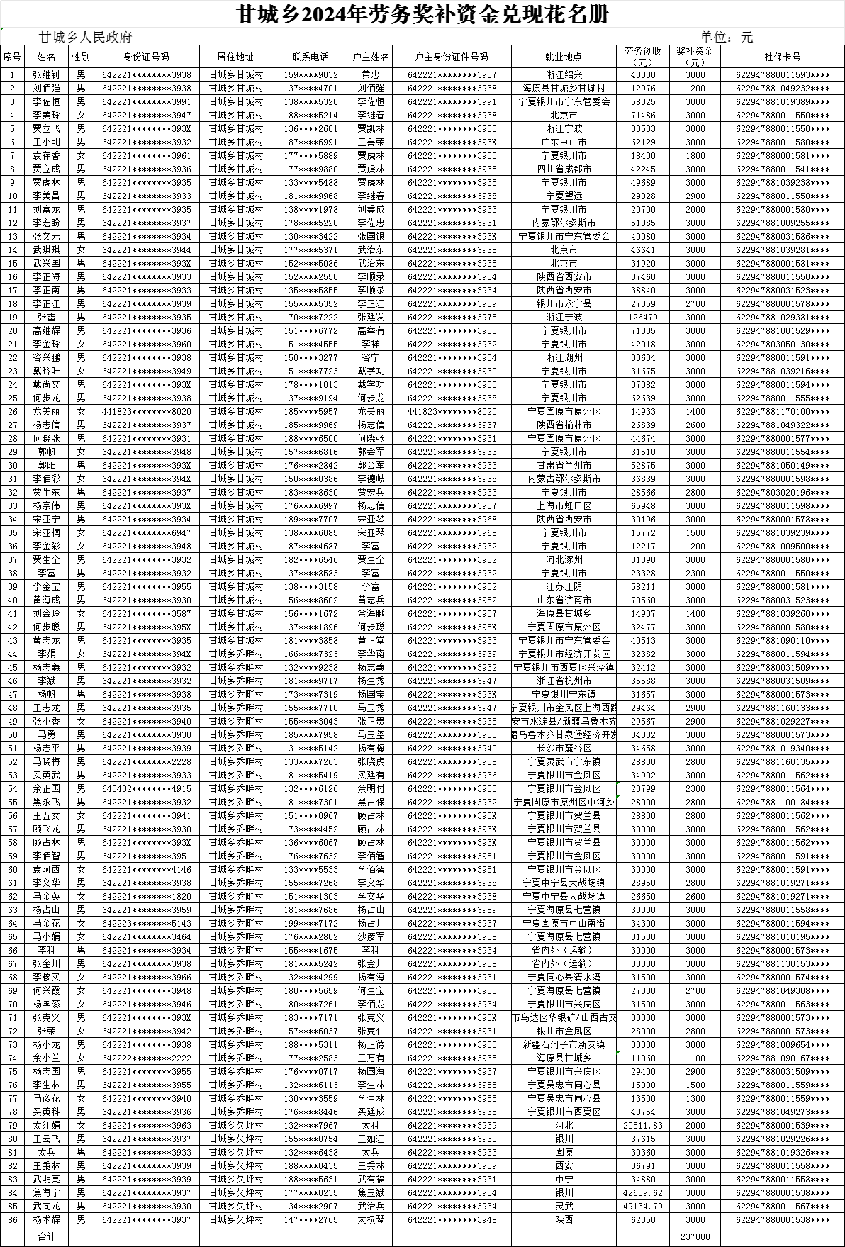 甘城乡2024年劳务奖补资金兑现花名册
