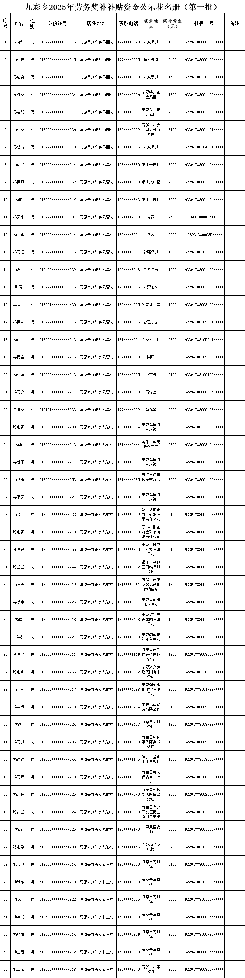 海原县九彩乡2025年劳务奖补补贴资金公示花名册(第一批)
