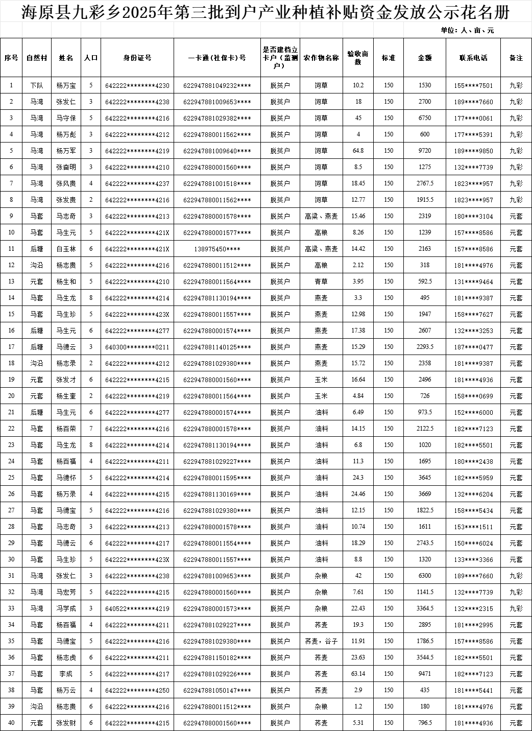 海原县九彩乡2025年第三批到户产业种植补贴资金发放公示花名册