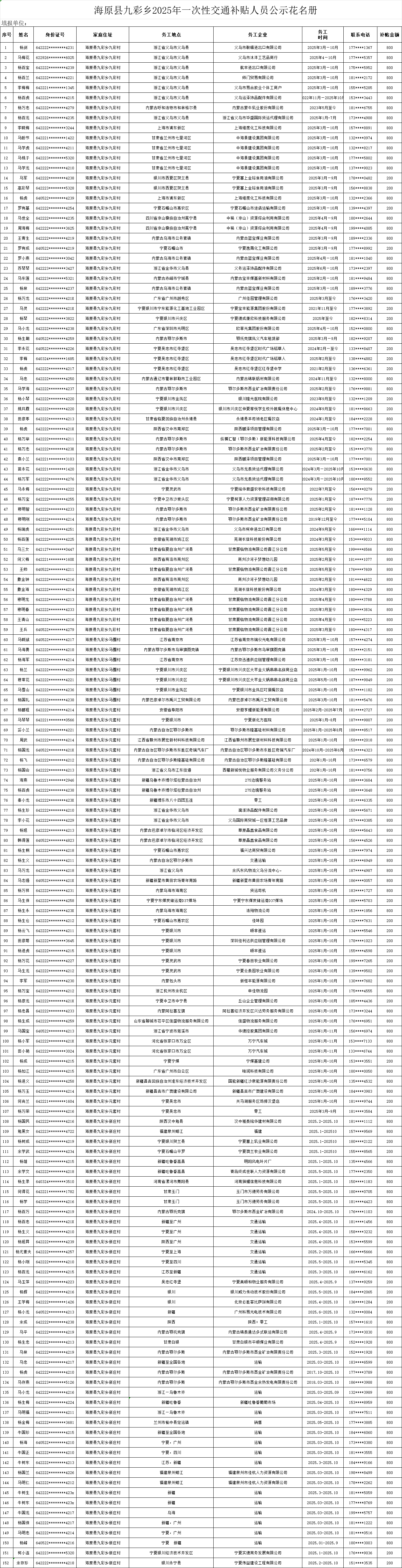海原县九彩乡2025年一次性交通补贴人员公示花名册