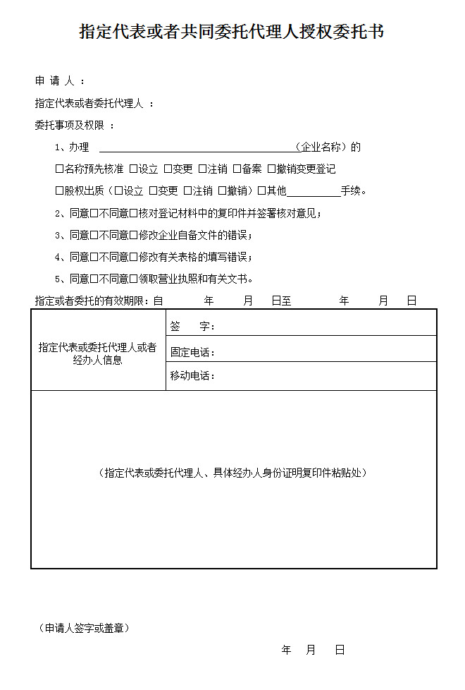 1.本委托书适用于办理企业名称预先核准,公司及其分公司、非公司企业法人及其分支机构、营业单位、非公司企业等办理登记(备案)、股权出质等业务。