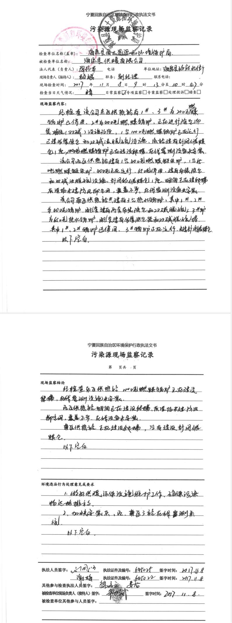 关于海原县供暖有限公司东南西区供热站2017年11月8日的污染源现场监察记录