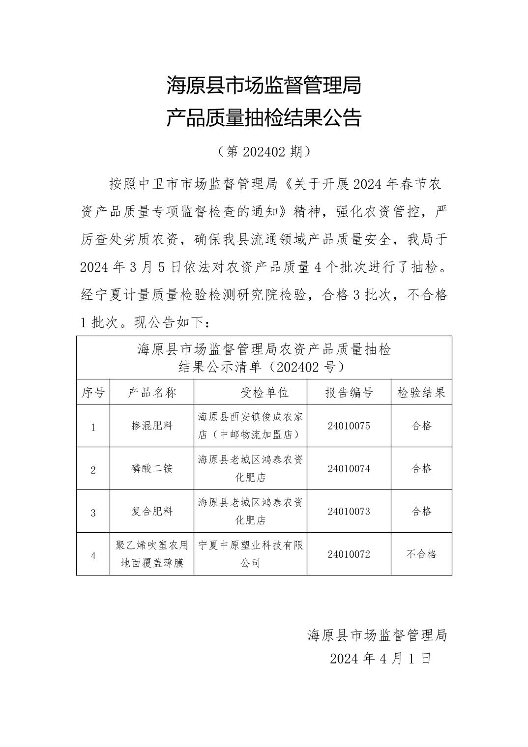 海原县市场监督管理局产品质量抽检结果公告(第202402期)
