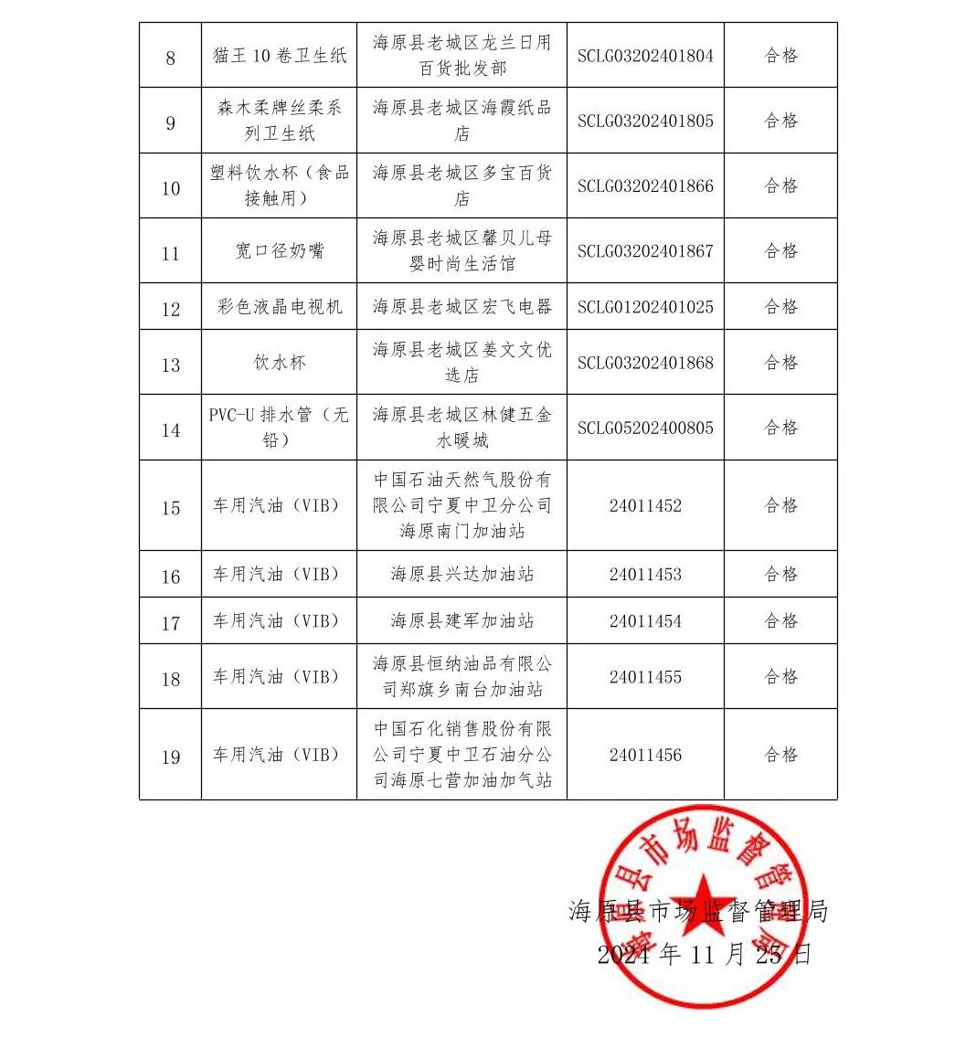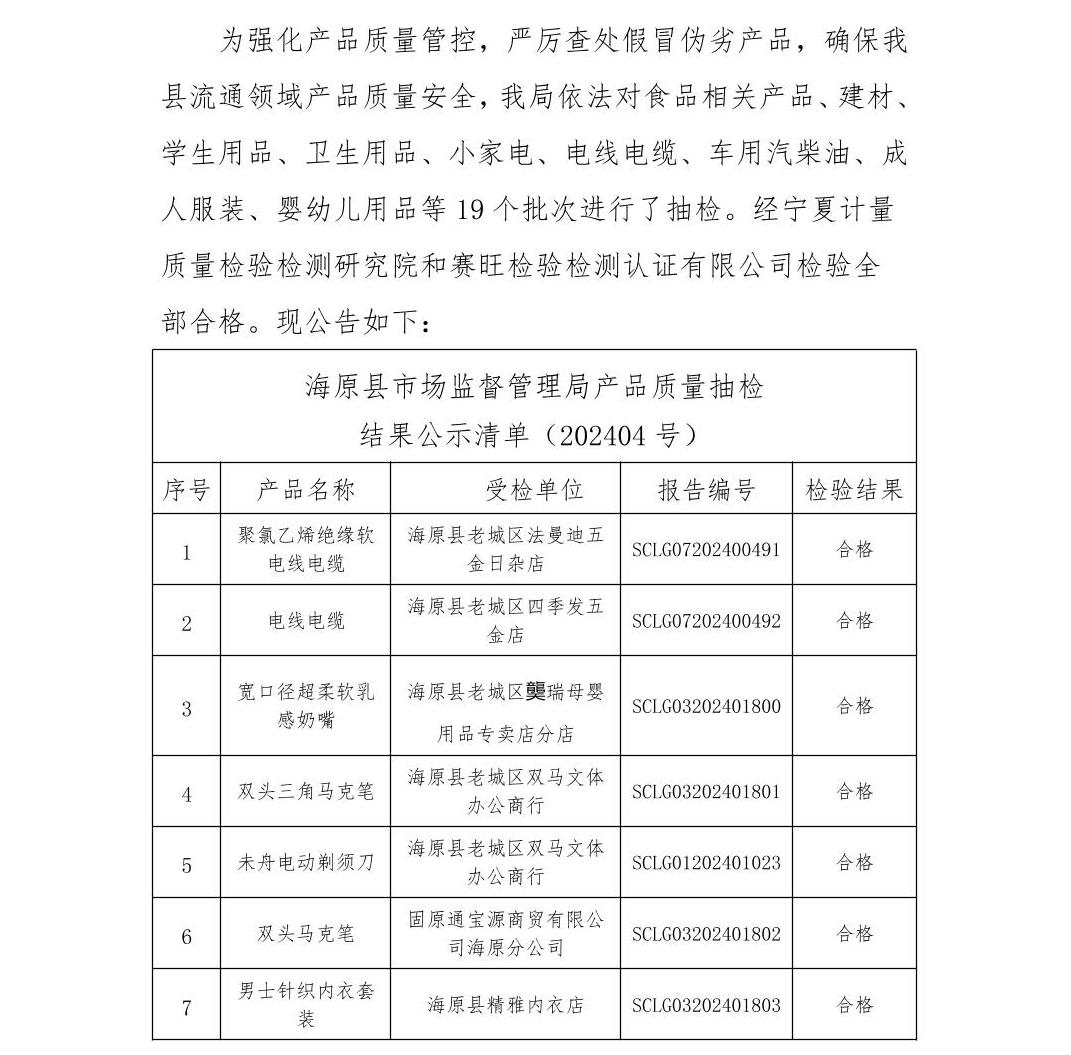 海原县市场监督管理局产品质量抽检结果公告(第 202404 期)