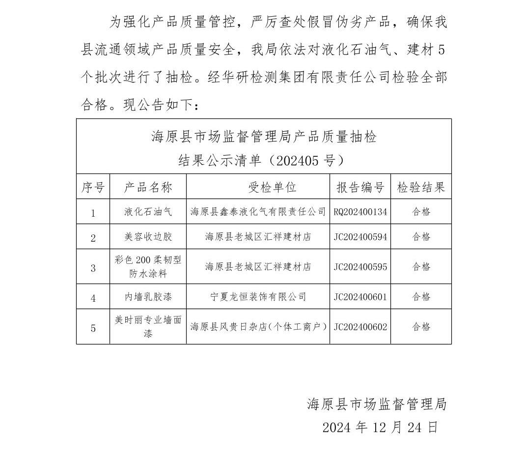 海原县市场监督管理局产品质量抽检结果公告(第 202405 期)