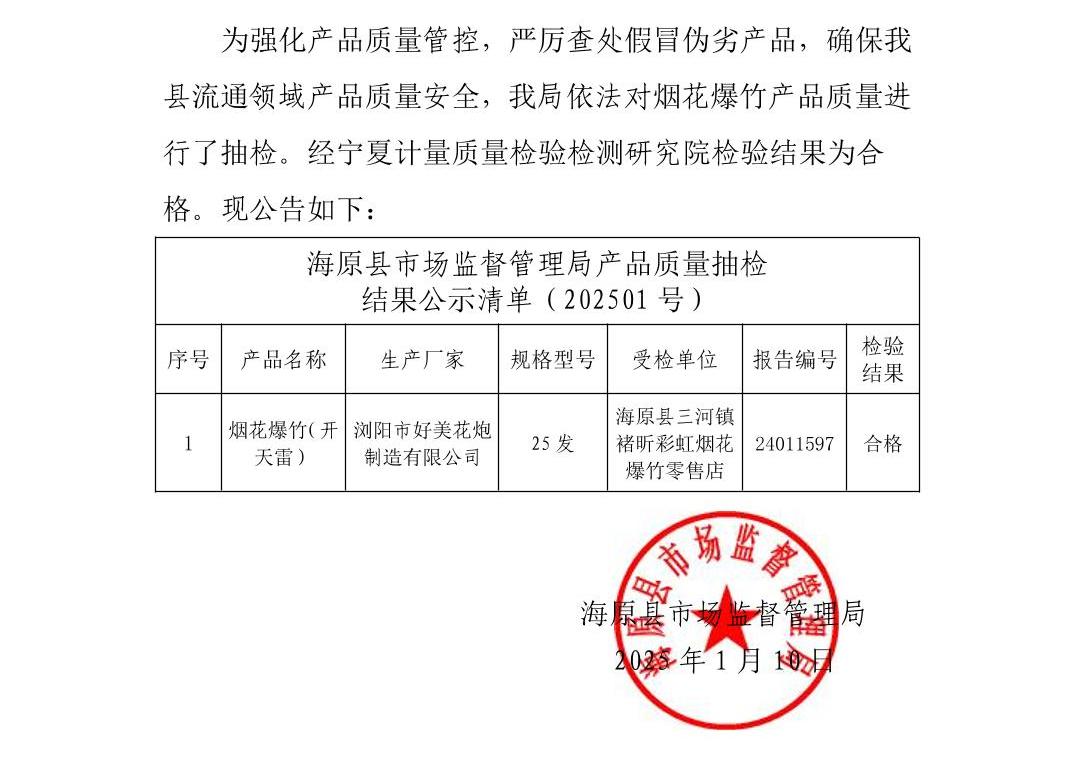 海原县市场监督管理局 产品质量抽检结果公告(第202501期)