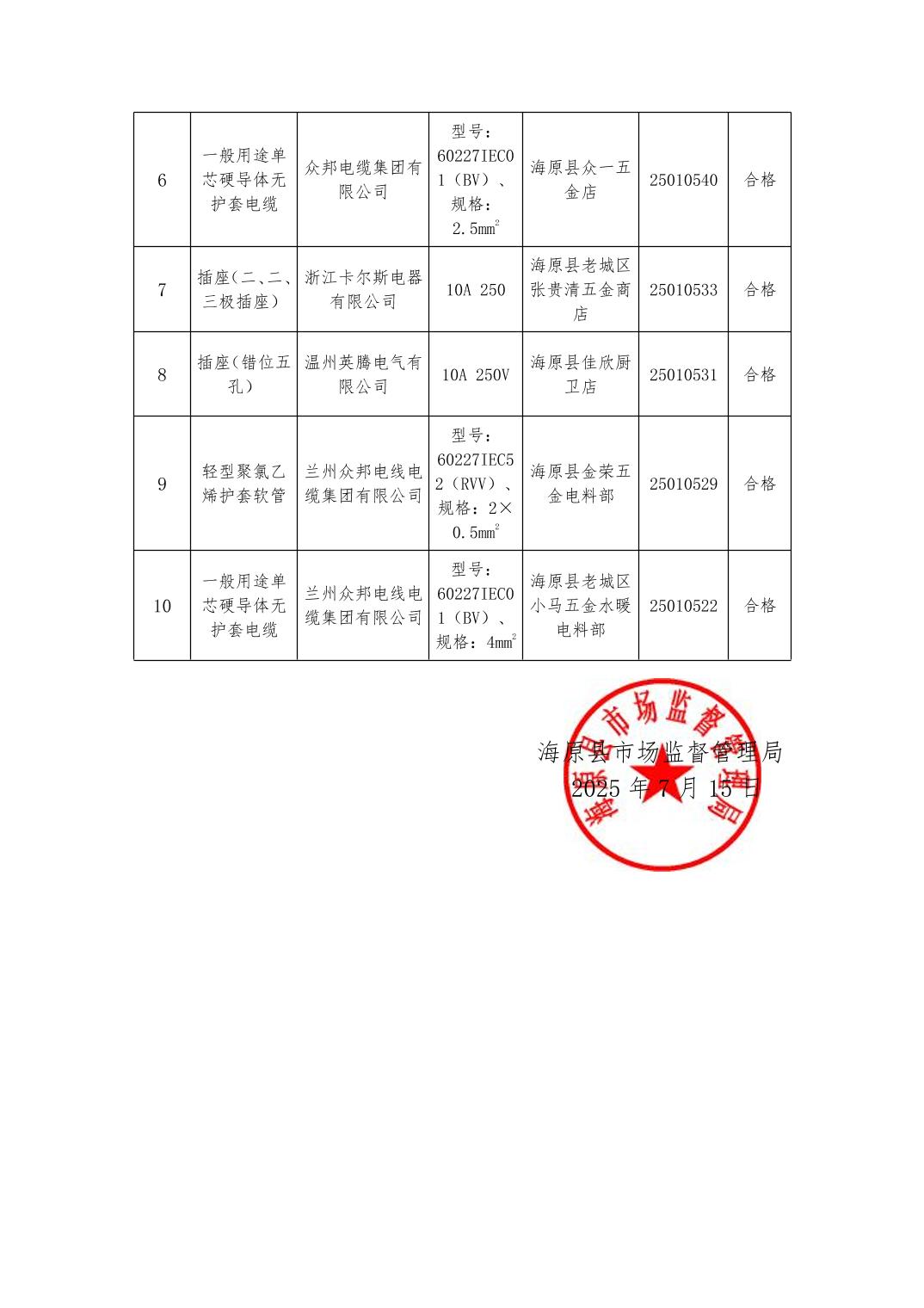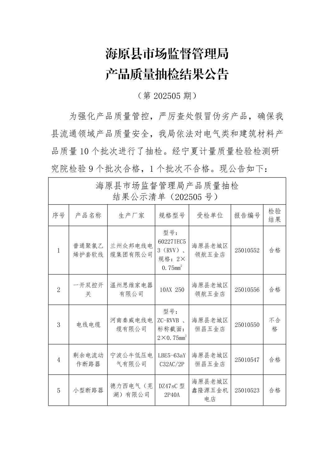 海原县市场监督管理局产品质量抽检结果公示清单(202505号)