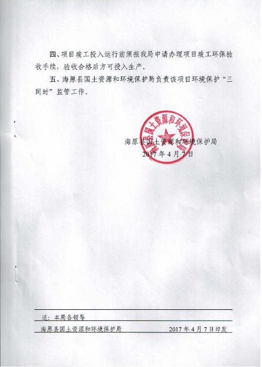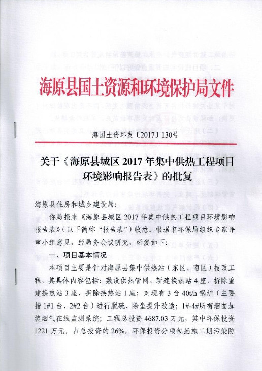 关于《海原县城区2017年集中供热工程项目环境影响报告表》的批复