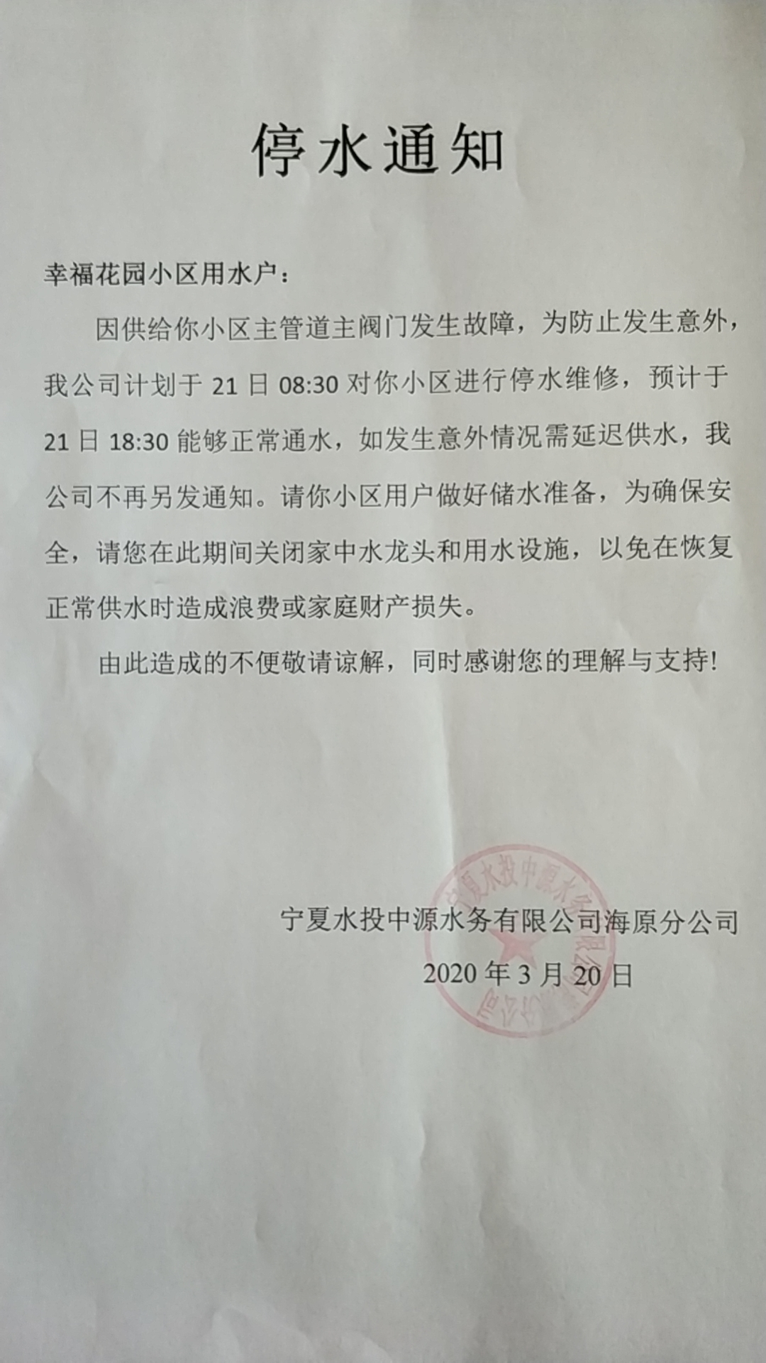 幸福花园小区停水通知