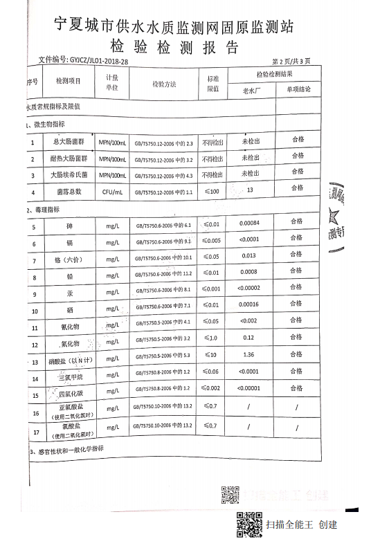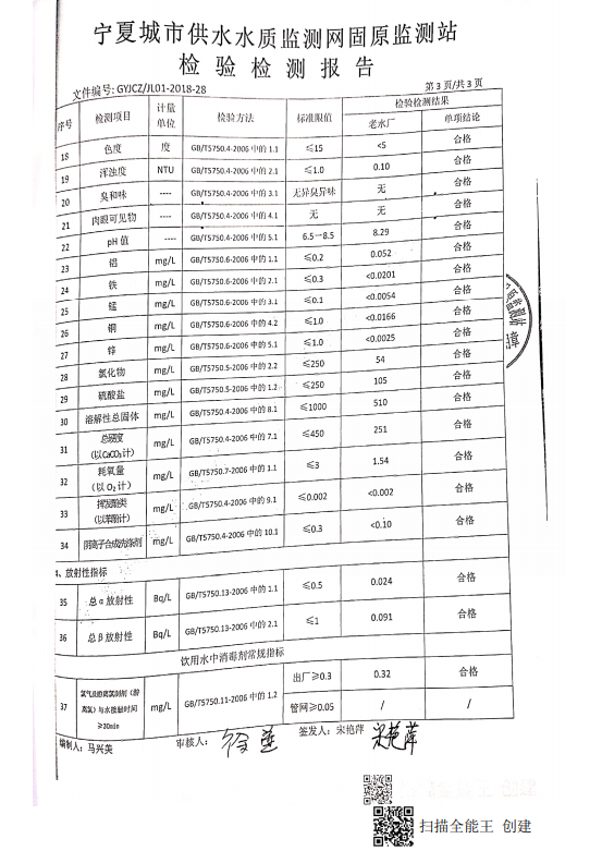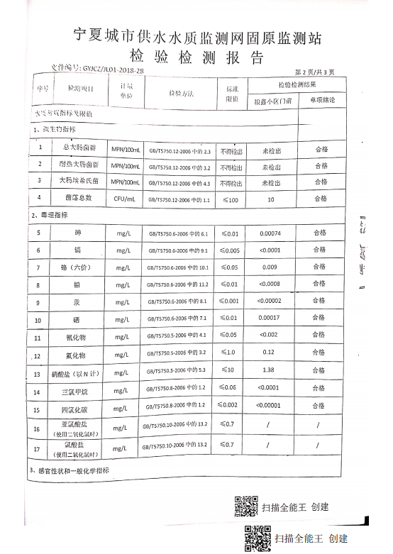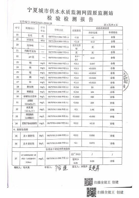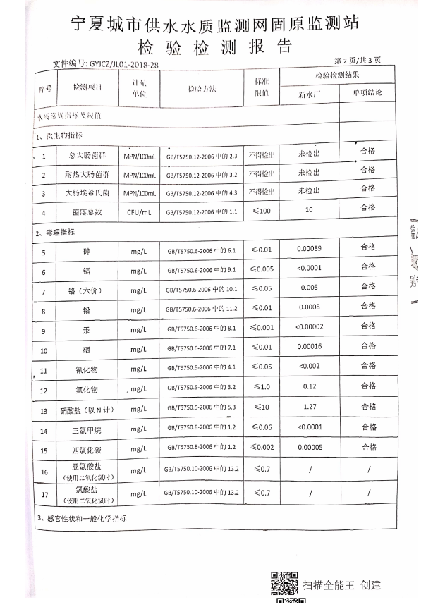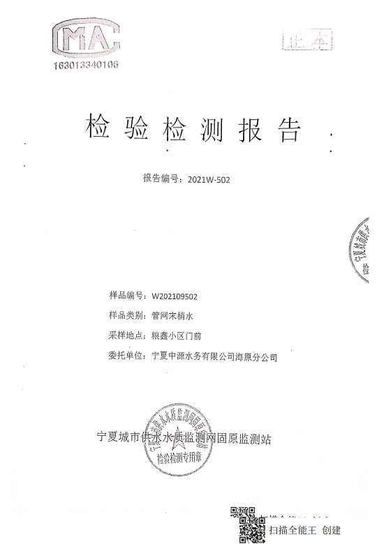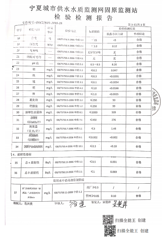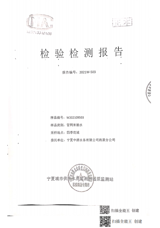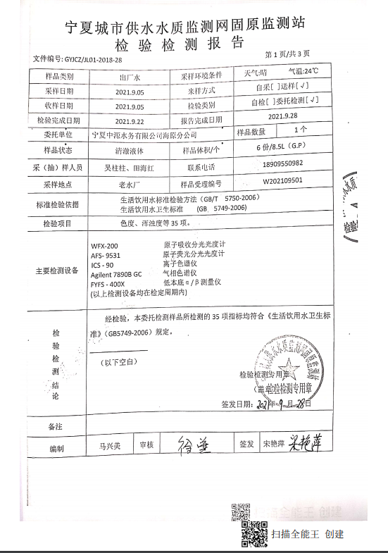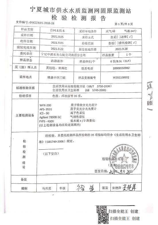 海原县2021年9月份自来水水质检验检测报告