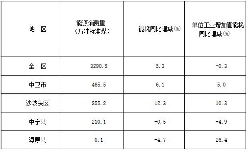 2019年1-6月份,全县规模以上工业能源消费量0.1万吨标准煤,能耗同比下降4.7%,增速比全区平均水平低10.0个百分点,比中卫市低10.9个百分点,比沙坡头区低17.0个百分点,比中宁县低4.2个百分点。